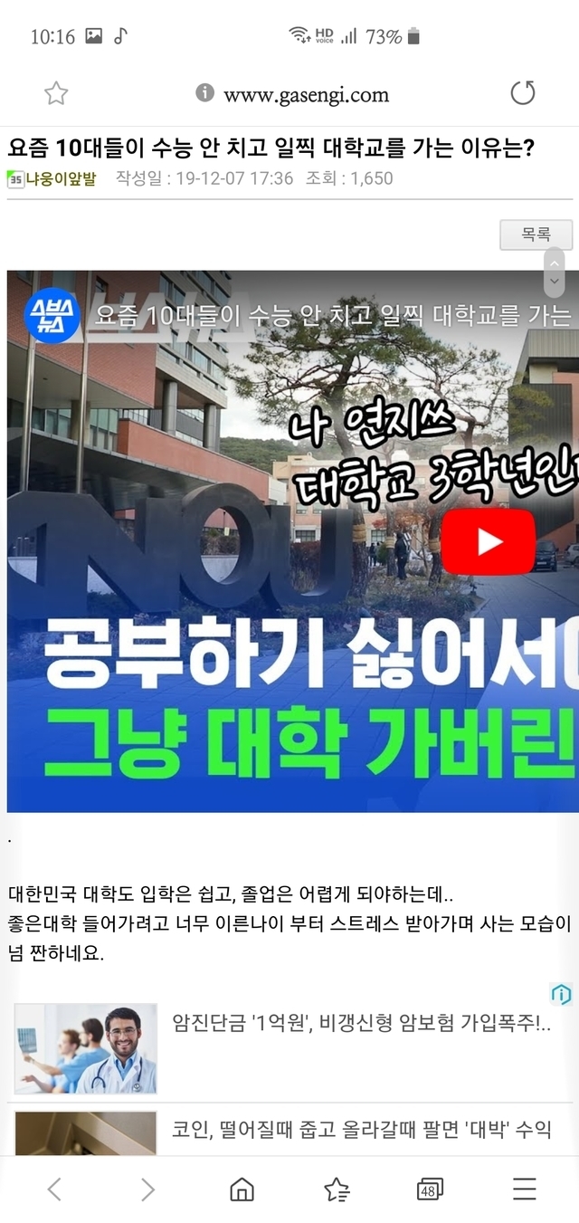 19.12.08 92 읽음 이전글다음글 요즘 10대들이 수능 안 치고 일찍 대학교를 가는 이유는? yeok9999 구독하기 0 3 콘텐츠의 수익 36 대한민국 대학도 입학은 쉽고, 졸업은 어렵게 되야하는데..좋은대학 들어가려고 너무 이른나이 부터 스트레스 받아가며 사는 모습이 넘 짠하네요.http://www.gasengi.com/m/bbs/board.php?bo_table=commu06&wr_id=1148149&page=2 3 0 / 300 입력