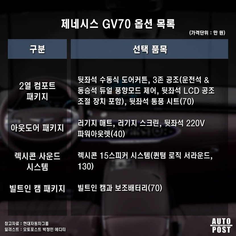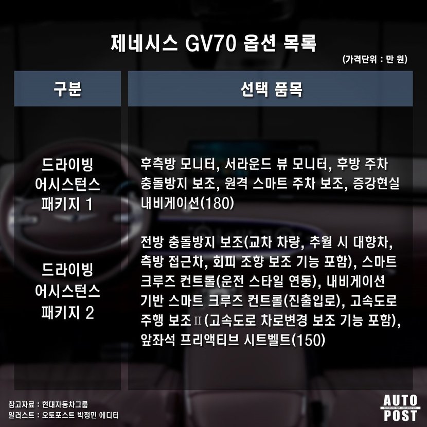 그 외에 프리뷰 전자제어 서스펜션과 고급스러운 실내 디자인, 스포티한 감성을 높여주는 스포츠 패키지까지 비록 동급 수입차 상위 모델도 고려할 수 있을 만큼 비싸지긴 하지만 그만큼 옵션이 풍부하고 GV70에만 존재하는 최첨단 사양들도 존재해 옵션 구성을 놓고 비교해보면 경쟁력은 충분히 있다.