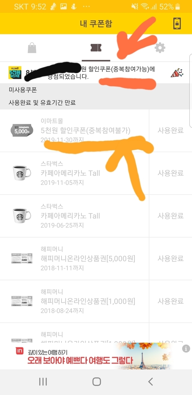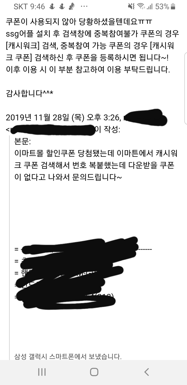 19.12.08 122 읽음 캐시워크 이마트쿠폰 사용법 생크림케익 구독하기 0 5 콘텐츠의 수익 41 캐시워크 이마트쿠폰 당첨돼서 SSG.com에 '캐시워크 쿠폰'이라고 쳐서 나오는 이벤트 창에 쿠폰번호를 적어 등록하려는데 사용불가 쿠폰이라며 사용이 안되는거에욧그래서 메일로 문의하니 친절하게 답이 오긴왔는데 쿠폰 만료기간이 지나서 와서 무용지물 쿠폰이 됐네요.ㄷㄷ쿠폰이야 쉽게 당첨돼지만 조금 억울했네요ㅎㅎ중복참여쿠폰이면 '캐시워크 쿠폰'중복참여불가쿠폰이면 '캐시워크'라고 검색해야된다네요.참고하세요~ 5 0 / 300 입력