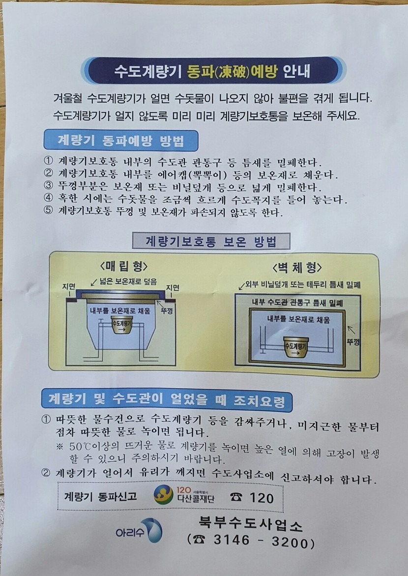 20.12.24 90 읽음 수도계량기 동파 예방 방법 잇힝잇힝잇힝 구독하기 0 1 콘텐츠의 수익 6 북부수도사업부에서 이런걸 보내줬네요~여러분도 같이 알면 좋을거 같아 찍어서 올려요!! 1 0 / 300 입력
