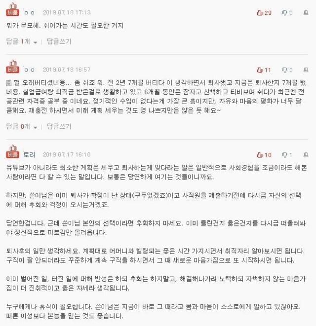 유투브에 퇴사관련 영상을 보니까 댓글에 백수되면 더 괴롭다, 최소한 계획은 세우고 퇴사를하는게 맞다. 이런 댓글들이 많으니까 제가 이런이유로 계획도 없이 퇴사를 하는게 맞는건지 모르겠어요 ㅠㅠ 이미 퇴사확정은 났지만 사직서 쓰기 전입니다..