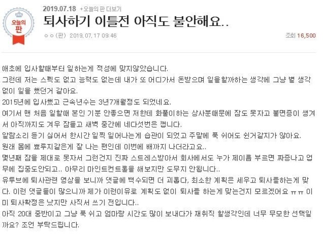 하지만, 쓴이님은 이미 퇴사가 확정이 난 상태(구두였겠죠)이고 사직원을 제출하기전에 다시금 자신의 선택에 대해 후회와 걱정이 오시는거겠죠.