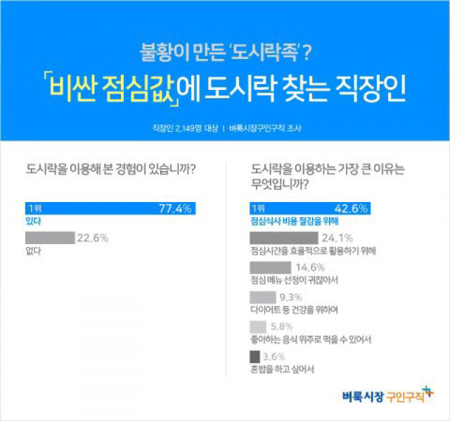 벼룩시장구인구직(대표 장영보)이 직장인 2149명을 대상으로 설문조사를 진행한 결과 ‘점심식사로 도시락을 이용해 본 경험이 있다(77.4%)’고 답했다. 도시락 이용 횟수는 ‘주 2~4회(52.4%)’가 가장 많았다.