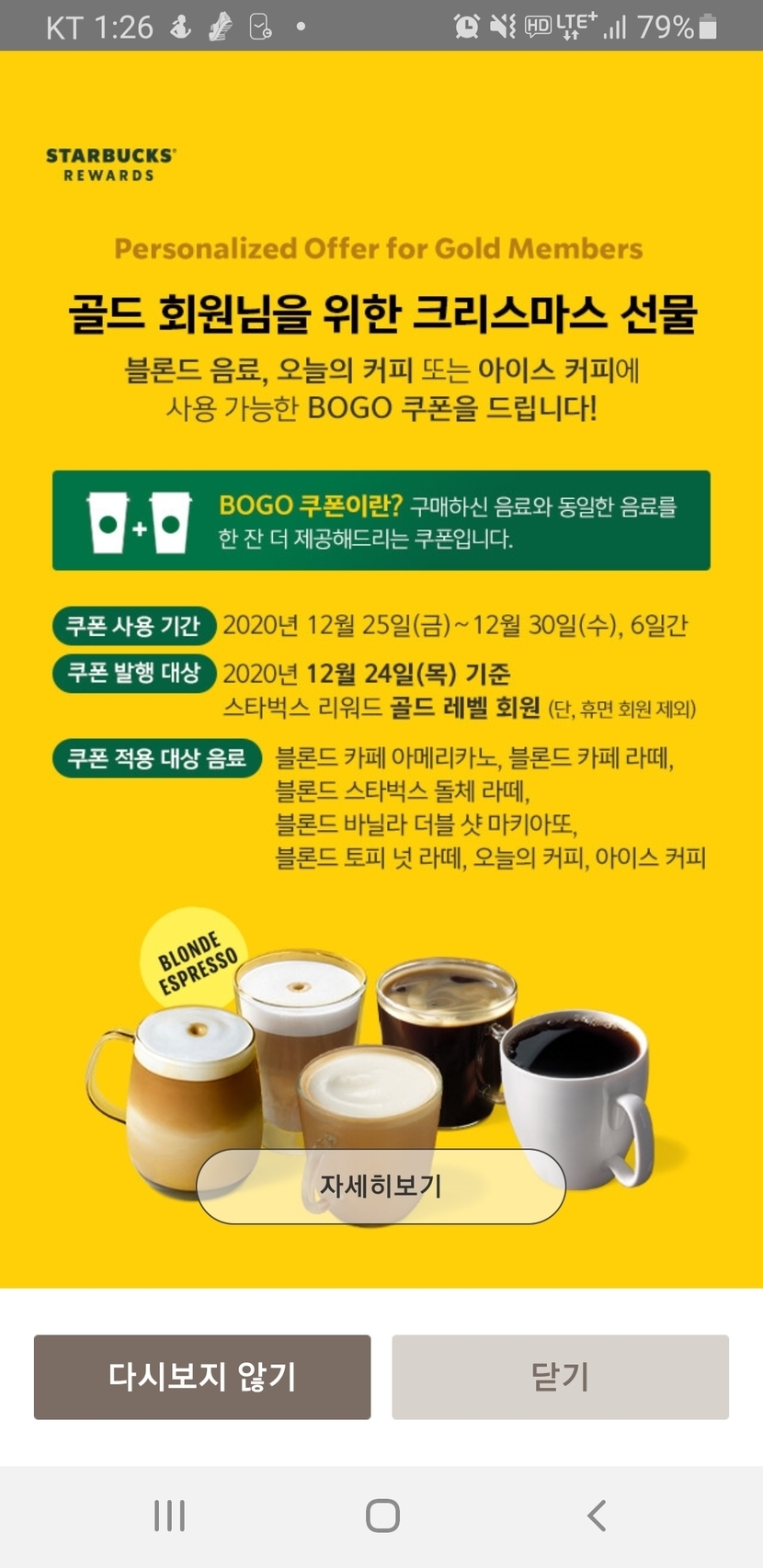 20.12.29 181 읽음 ⭐스타벅스에서 받은 쿠폰 알뜰살뜰 사용하기⭐ 건강생활 맞답방&댓글,좋아요 구독하기 18 15 콘텐츠의 수익 21 스타벅스에서 골드회원에게 크리스마스선물로bogo쿠폰을 줬더라구요제가 요즘 바빠서 스벅도 못가서 쿠폰 받은 줄도 몰랐는데유효기간이 2일남았다는 알림을 받고서야부랴부랴오늘 스벅가서 bogo쿠폰을 사용했습니다토피넛라떼를 주문하고 싶었는데 블론드 라인 커피는 다나가서ㅜ.ㅜ오늘의커피를 주문했습니다텀블러에 담아서 냉장고에 두었다가 커피 먹고 싶을때뜨거운 물이랑 섞어 마시면 좋답니당ㅎ.ㅎ 15 0 / 300 입력