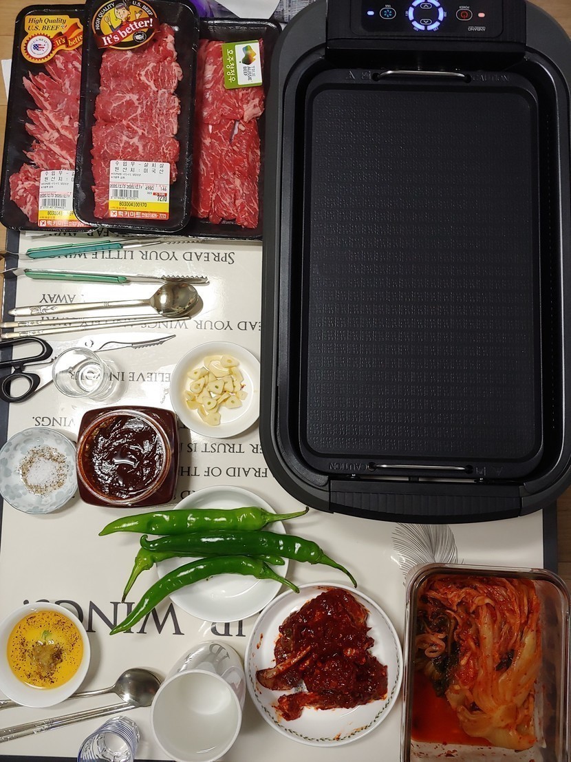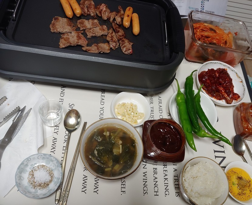 어제 간만에 마트들려 소고기 좀구매해서 굽기로 합니다.세팅하고소고기 조금씩 올려봅니다.시금치국도 준비하고시장표 매콤양념게장도 준비하고김치 한포기 좀 내어놓고..1번 굽고2세번 다구어 먹었네요.. 근게 소고기는 왜 배가 차지않을까요😅😅😅힘든시기라 외식도 접어서 집에서 열시미 풀가동 먹방하게되네요. 특별히 비싼 음식은 아니지만 이렇게 소소하게 저녁한끼로 마음의 양식을 채우네요.. 새해가 1시간더 안남았네요.. 내년엔 행복 만땅인 새해를 맞이해보아요^^ 모두모두 행복하기요🎐🎐🎐🎆🎆🎆🎐🎐🎐