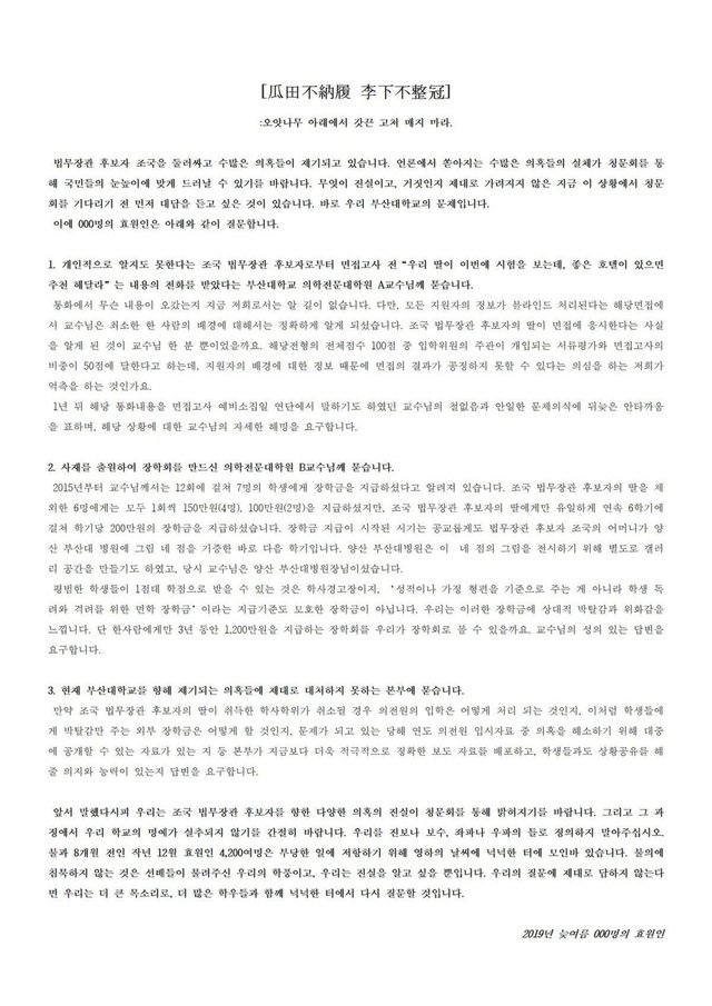 법무장관 후보자 조국을 둘러싸고 수많은 의혹들이 제기되고 있습니다. 언론에서 쏟아지는 수많은 의혹들의 실체가 창칭문회를 통 해 국민들의 눈높이에 맞게 드러날 수 있기를 바랍니다. 무엇이 진실이고, 거짓인지 제대로 가려지지 않은 지금 이 상황에서 칭문 회를 기다리기 전 민저 대답을 듣고 싶은 것이 있습니다. 바로 우리 부산대학교의 문제입니다. 이에 000명의 효원인은 아래와 같이 질문합니다.