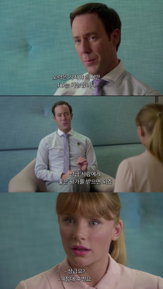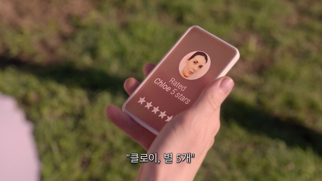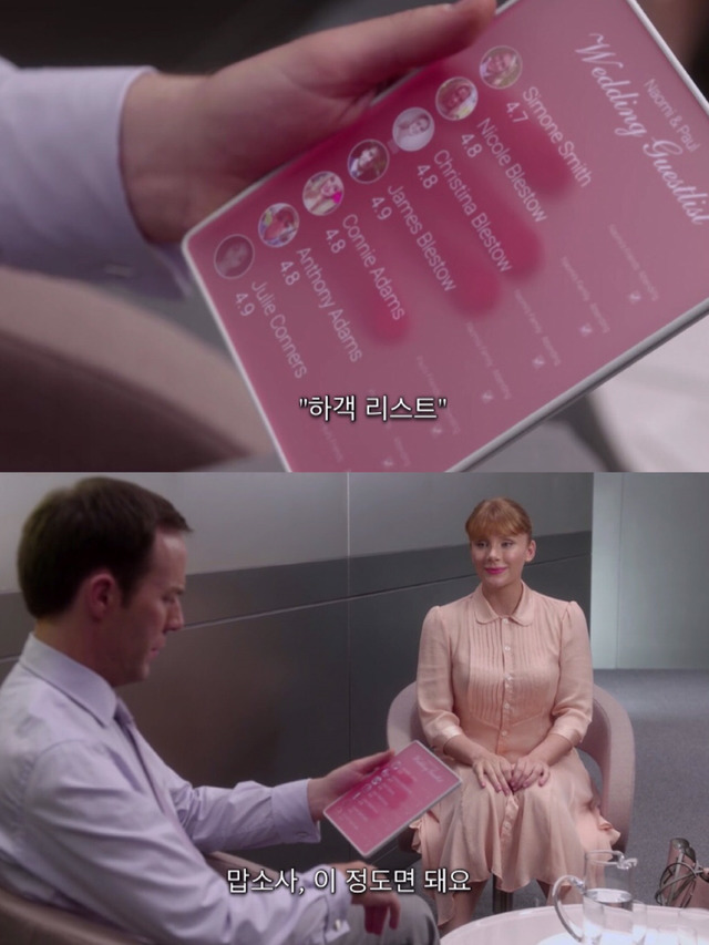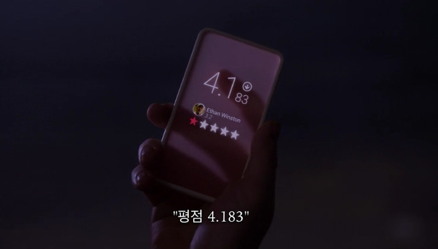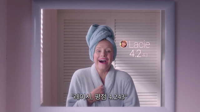 거울앞에서 웃는 얼굴 연습중인 레이시레이시의 평점은 5점 만점에 4.2점틈틈히 sns로 사람들과 별점을 주고받음물론 폰으로 이렇게 마주친 사람과 별을 주고 받을 수도 있음sns에 올리기위해 일부러 카페를 찾아가기도 하고맛없어서 한입 먹고 뱉어버림;; 커피도 우웩거려ㅠㅠ각자 눈에 칩이 심어져있어서 얼굴만 봐도 사람들의 평점이 보임한편 남동생과 같이 사는 레이시의 집은 곧 계약 만료집을 보러 왔는데 엄청 맘에 들어해 하지만 너무 비쌈....평점이 4.5가 되면 할인을 받을 수 있다는 이야기를 듣고 평점 상승을 자문하러 전문가까지 찾아감4점 후반대 상급 사람들에게 높은 별점을 받으면 빠르게 평점을 올릴수 있다는 전문가그리고 그날 밤 평점 4.8점 옛 친구 나오미에게 아주 오랜만에 전화가 와서 흥분한 레이시결혼식 참석은 물론이고 들러리까지 해달라는 친구의 말에눈물까지 보이며 좋아하는 레이시알고보니 나오미는 어릴적 레이시를 엄청 괴롭혔던 친구...나오미 결혼식의 하객 리스트를 들고가자 단시간에 4.5점이 가능하다는 전문가 단숨에 집계약까지 마침축사까지 연습하고 이제 공항으로 떠나기만 하면 됨평점에 매달리면서 상급 사람들에게 굽신거리는 누나가 못마땅한 동생을 뒤로하고공항가는 택시를 탔는데 나오미와 전화하면서 엄청 시끄럽게 떠듦.