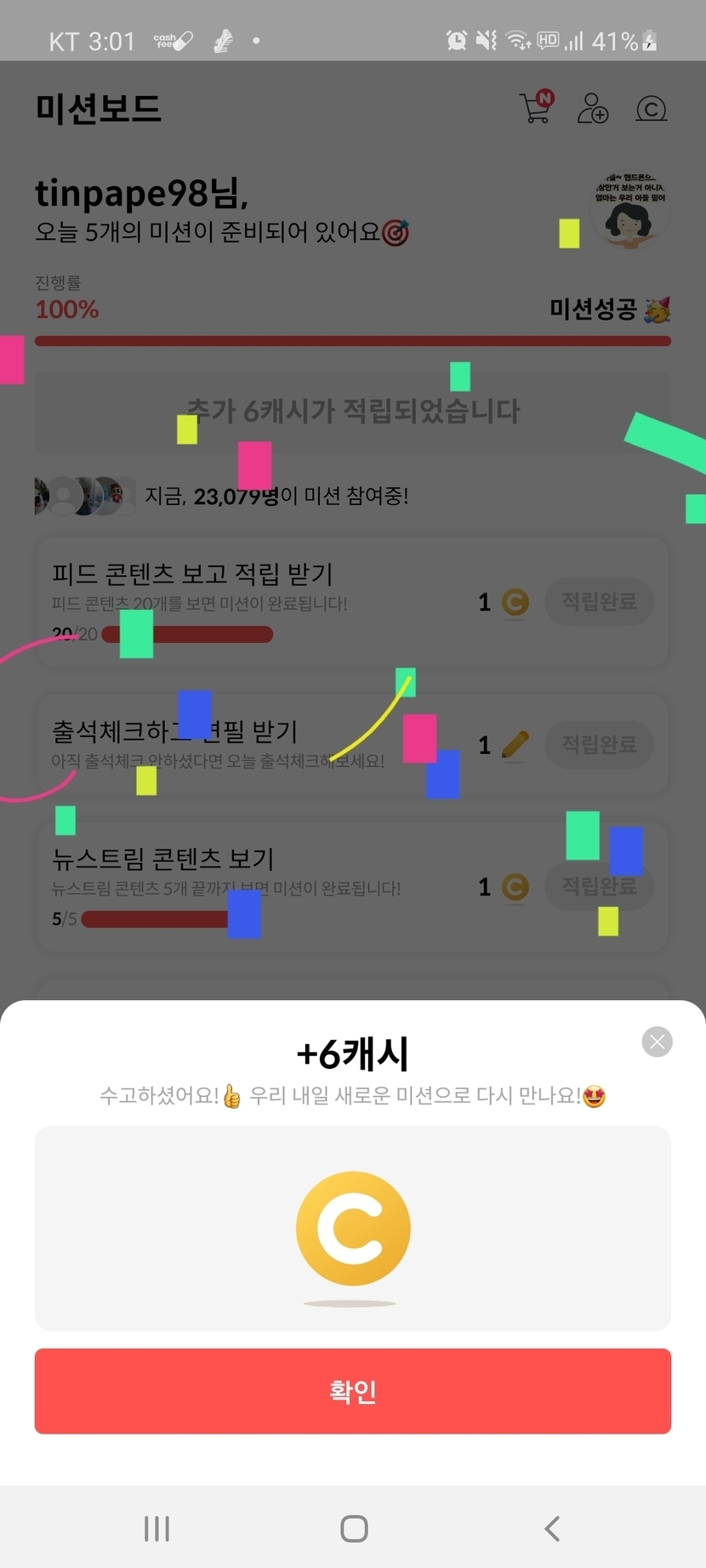 6캐시를 받았습니다.