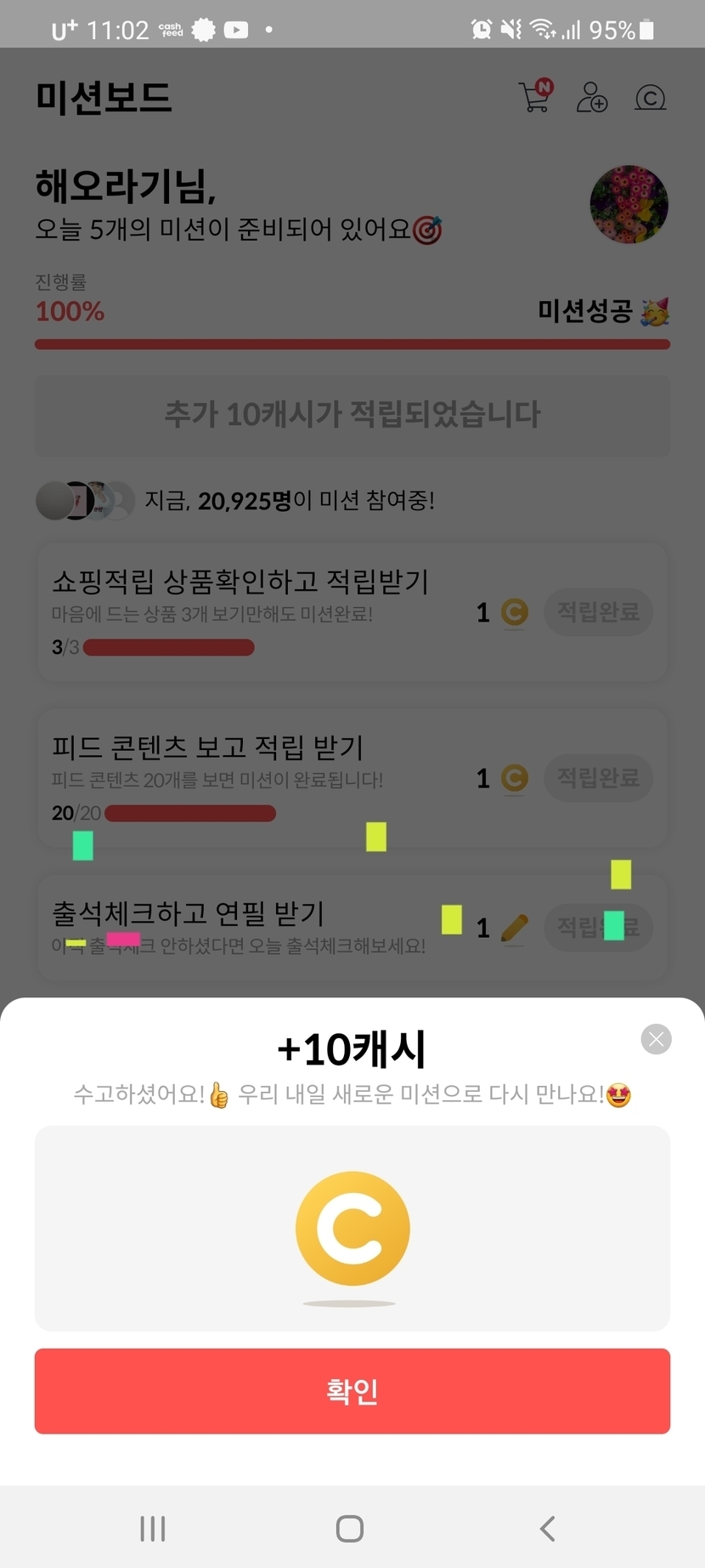 미션하면 3~5캐시만주더니 오늘은 10캐시주네요! ㅎㅎ