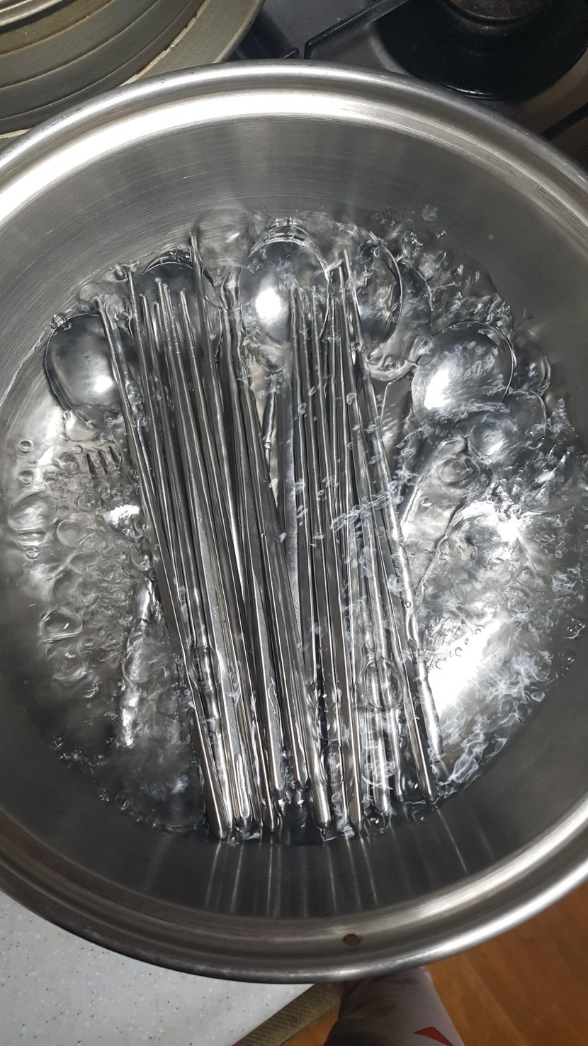 살균하기 위해 수저랑 젓가락을 삶아요
