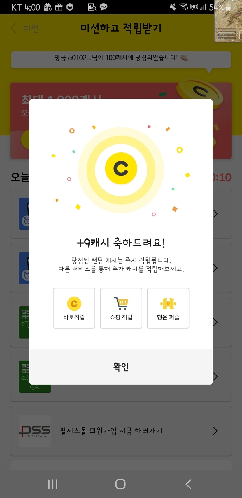 [캐시슬라이드 미션하고 적립받기] 9캐시 획득