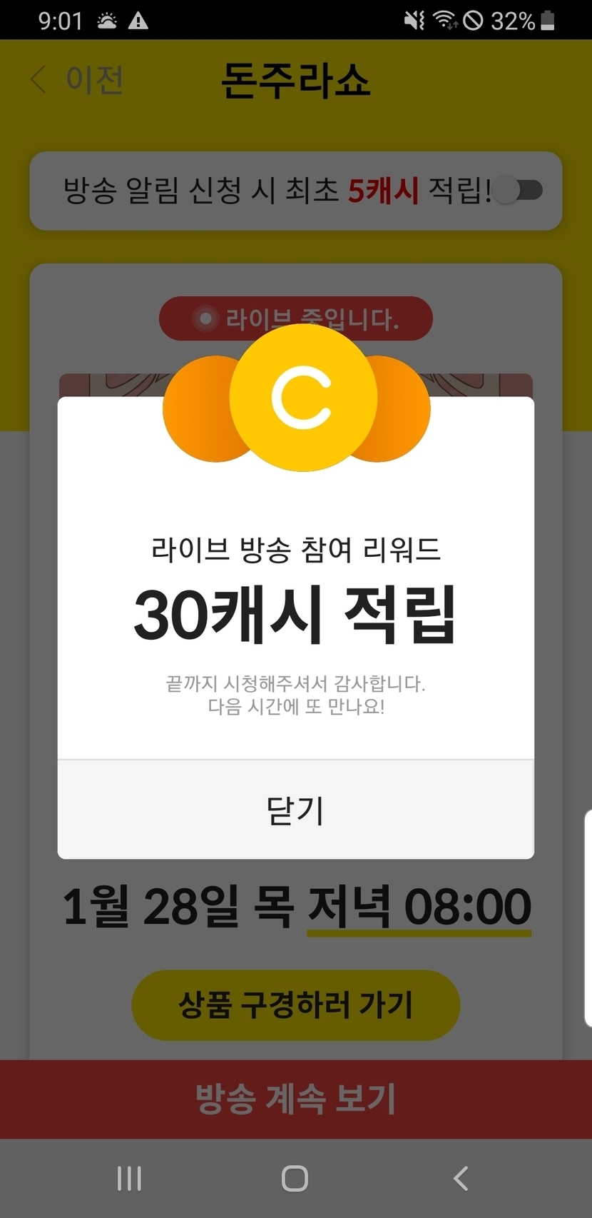 오늘 돈주라쇼 시청하고 받은캐시