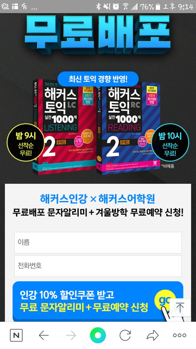 19.12.15 182 읽음 해커스 토익 교재 선착순 무료 소잃고뇌약간고친다 구독하기 0 2 콘텐츠의 수익 61 해커스 토익 교재 선착순 무료!자세히 보기 : http://iryan.kr/t5z5wntm8z실제 토익 시험 포인트 매회 적중!토익 고득점을 위한 필수 교재[1위 해커스 토익 교재 무료 배포]매일 밤 선착순 토익 교재 무료 받고입문부터 실전까지 토익 종결!무료 문자 알리미 신청만 해도해커스인강 전 강좌 10% 할인권 전원 제공친구 추천하면?토익 기출 포인트 LC/RC 교재까지 무료! (비매품) 2 0 / 300 입력