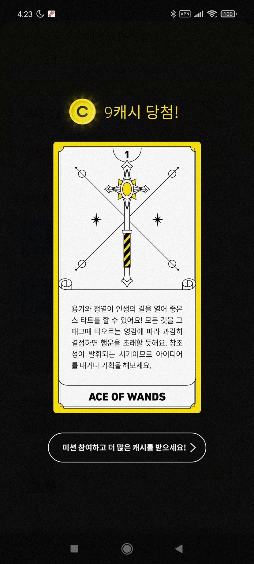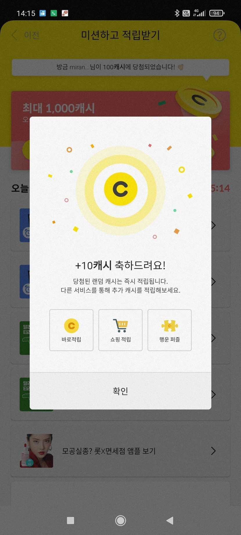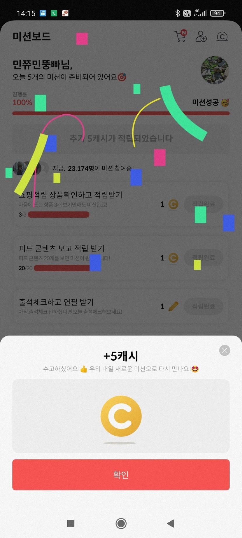 오늘의 미션완료 캐시