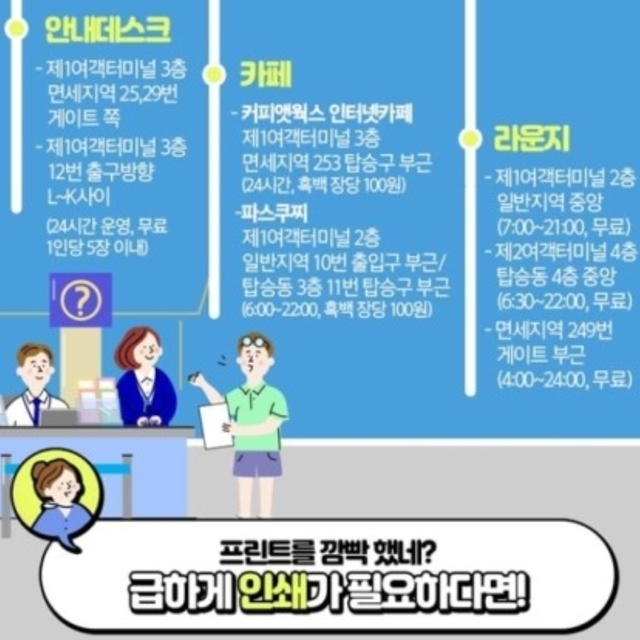 •제1여객터미널 2층 일반지역 10번 출입구 부근, 탑승동 3층 11번 탑승구 부근 파스쿠찌(오전6시~오후10시, 흑백 장당 100원)
