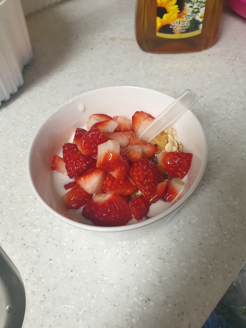 저는 꿀 듬뿍 넣고, 오트밀이랑 딸기 넣어먹었어요.