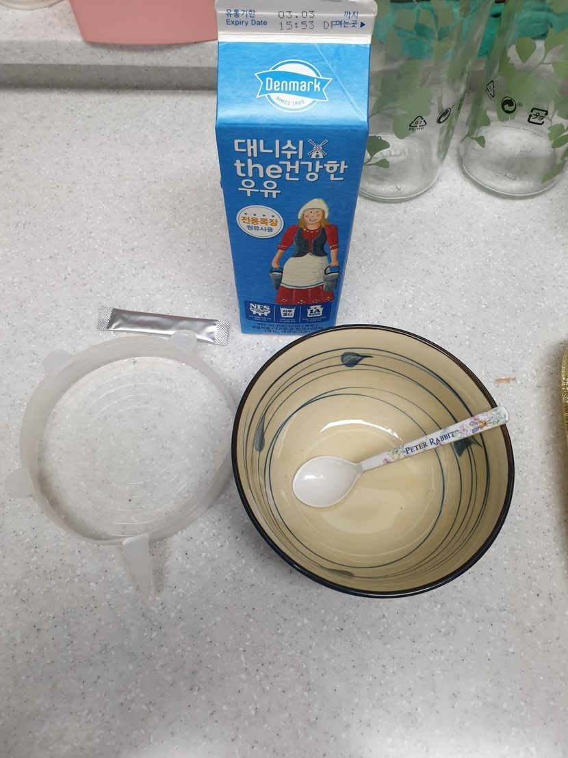 그릇 소독하기 귀찮았던 저는 편의점에서 300ml 우유를 사와서, 수저만 대충 소독한 뒤 우유팩을 이용했어요.