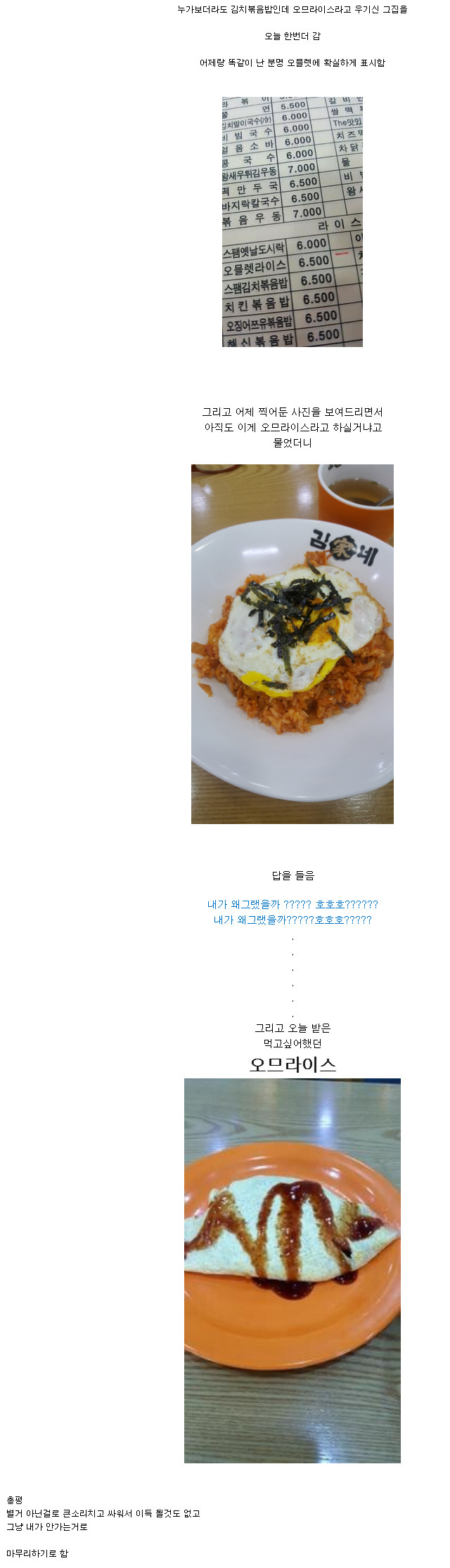 19.08.31 829 읽음 화남주의) 오므라이스 후기.jpg 슈퍼펭귄시리얼 구독하기 3 2 콘텐츠의 수익 0 전날 오므라이스 시켰는데 김치볶음밥 나옴사과는 개뿔, 그게 오므라이스라고 우김다음날 가서 오므라이스 시킴이번엔 제대로 나옴'호호' 시전이걸 참는다고? 2 0 / 300 입력