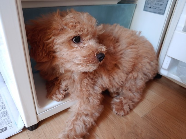 너무 더워서 냉장고안에들어간 울집 강아지 귀엽지않아요???