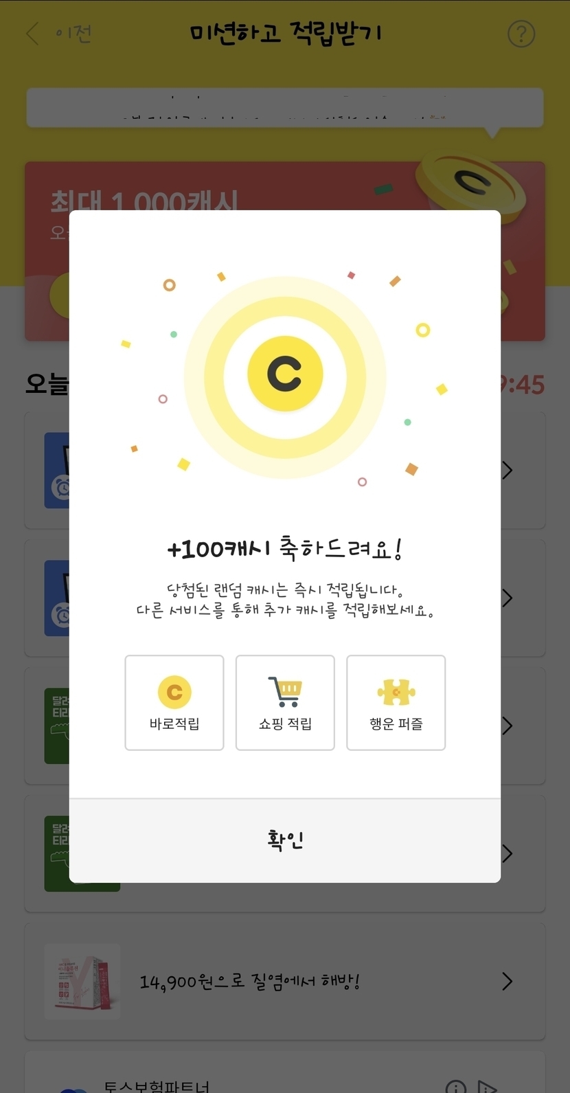 미션보상 100캐시