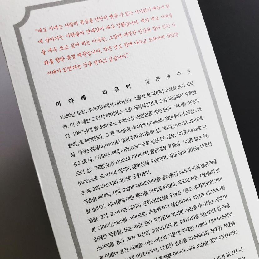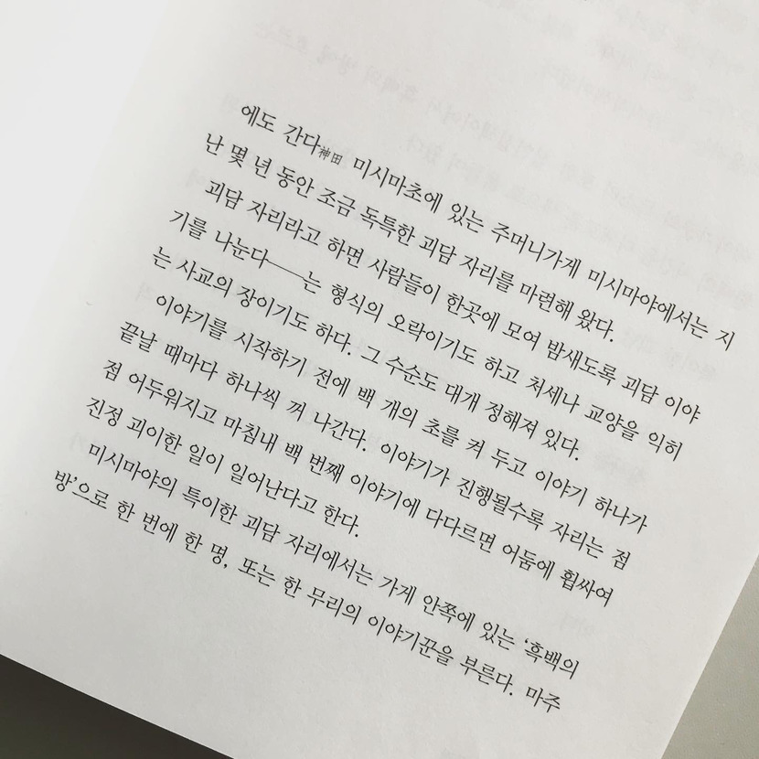 더욱 놀라운 건, 해를 거듭할수록 이야기가 점점 더 재미있어지고 완성도가 높아지고 있다는 것이다. <눈물점>부터는 세책가게로 시집간 오치카 대신 오치카의 사촌이자 미시마야의 주인 이헤에의 차남인 도미지로가 '흑백의 방'에서 손님들의 이야기를 듣는다. 오치카와 마찬가지로 사정이 있어서 쉬고 있는 중인 도미지로는, 흑백의 방에서 사람들이 들려주는 괴담을 들으며 미시마야의 명물 노릇을 하는 것으로 밥값을 대신하고자 한다.