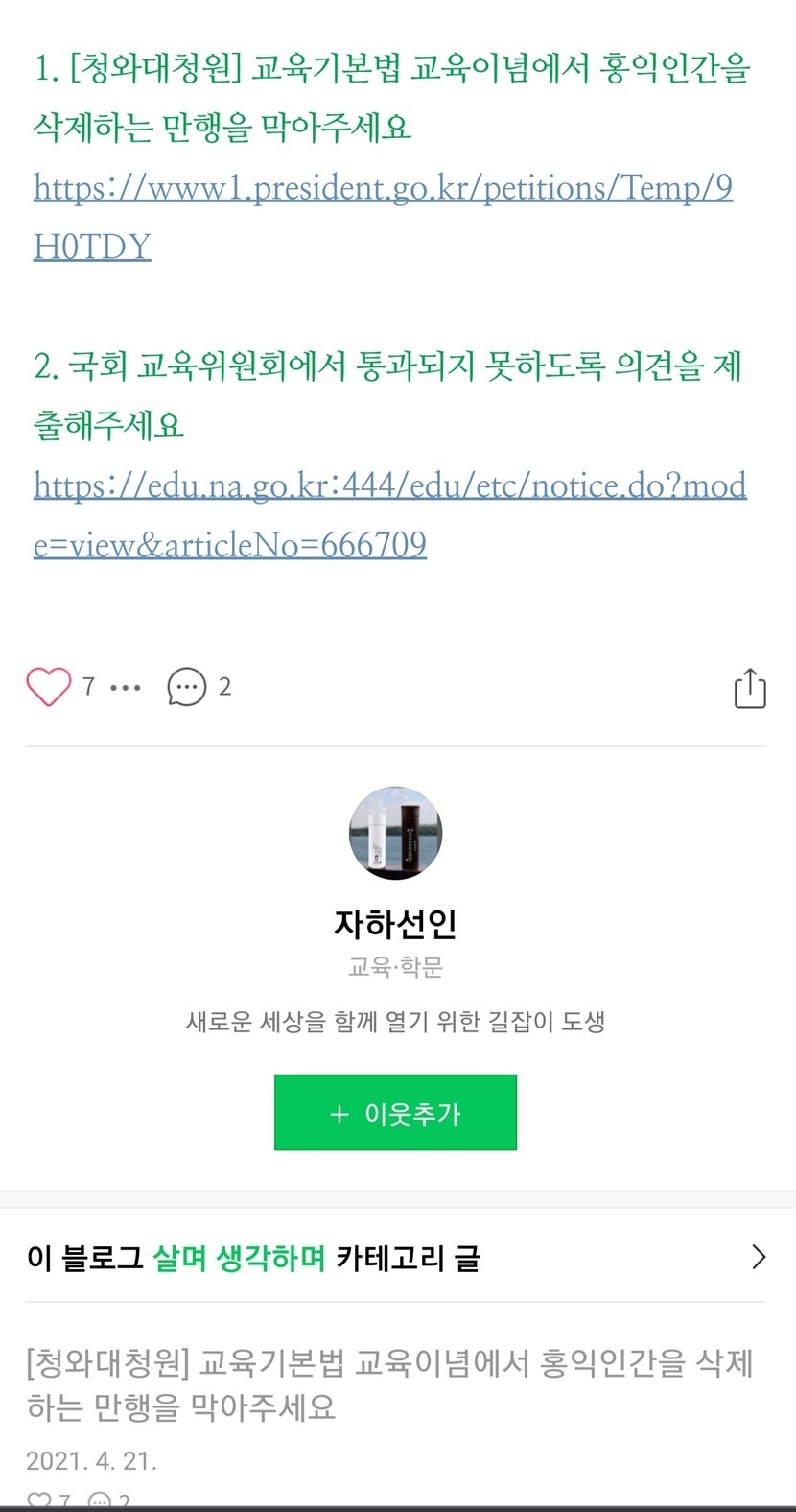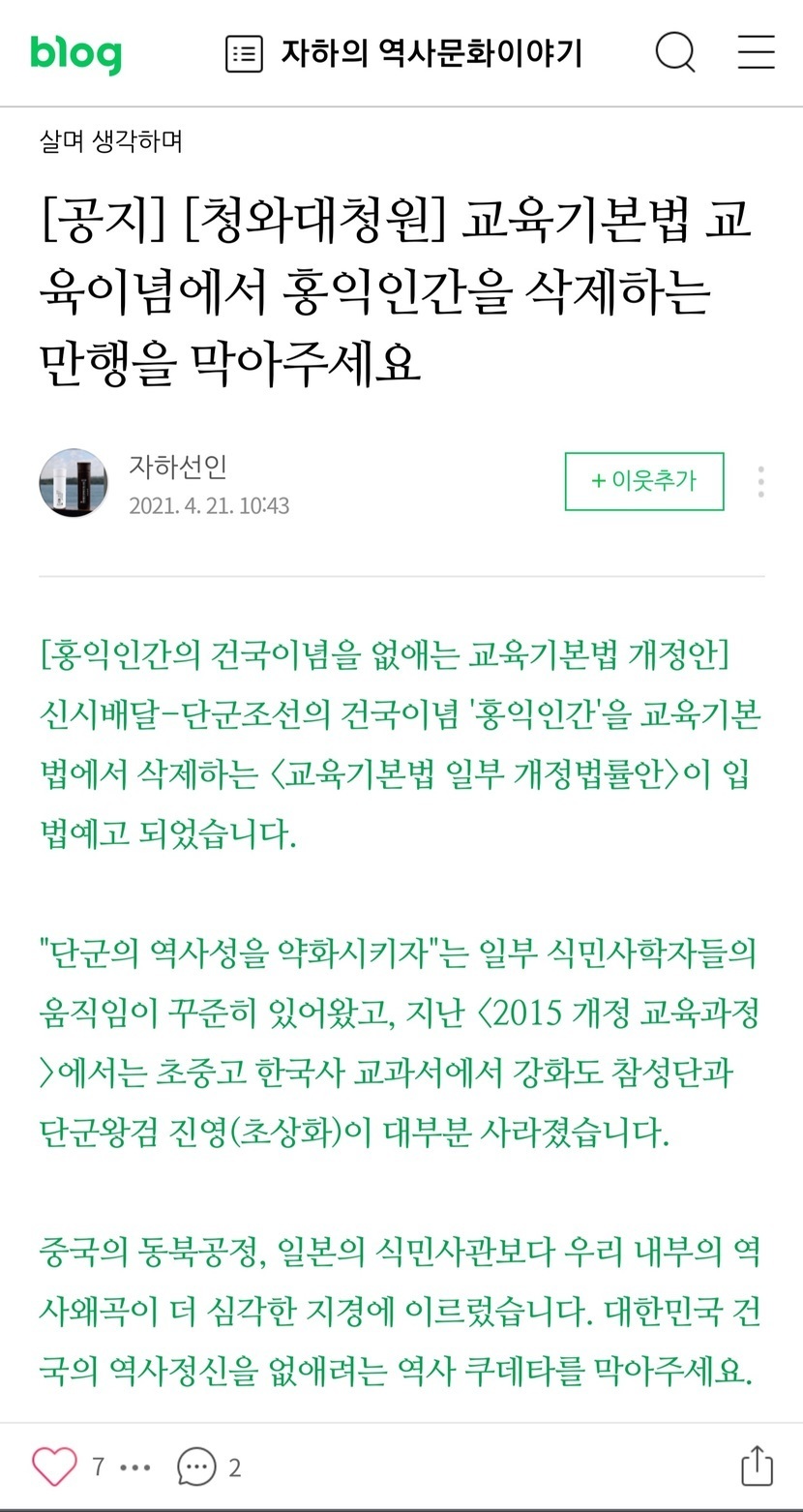 1. [청와대청원] 교육기본법 교육기본법 교육이념에서 홍익인간을 삭제하는 만행을 막아주세요.