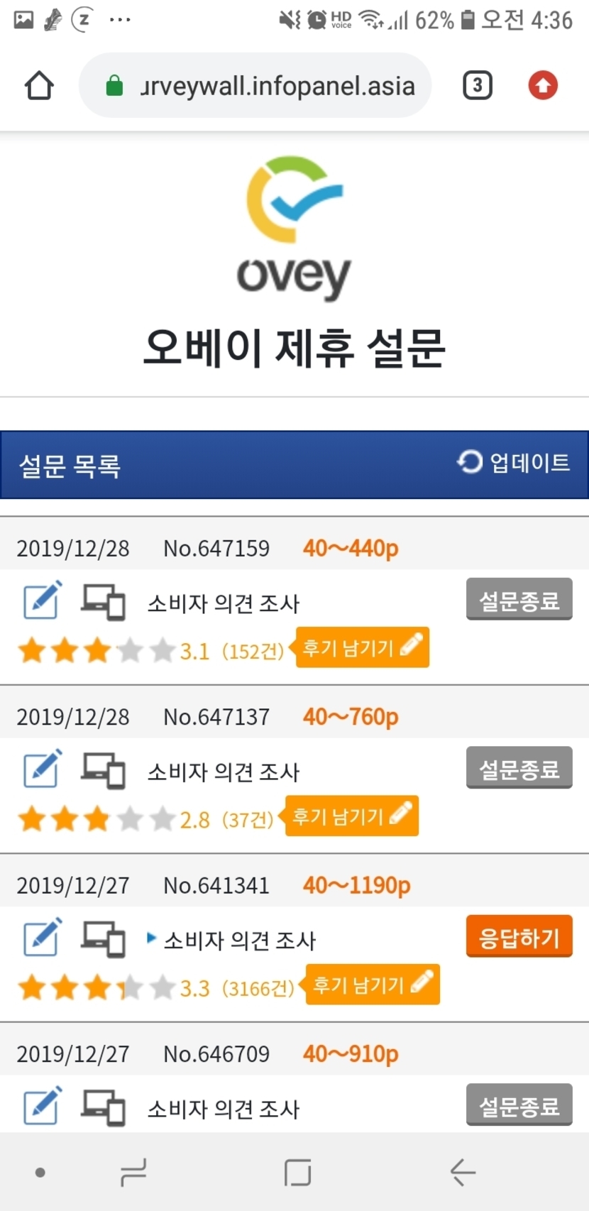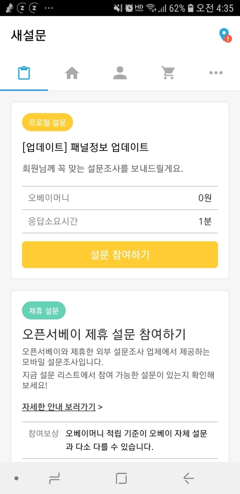 19.12.31 289 읽음 #스마트폰 쉽게 돈벌기#12 늑돌이님 구독하기 15 20 콘텐츠의 수익 66 설문조사 앱 오베이입니다.다음과 같이 기본정보 입력 및 업데이트통해설문조사를 받을수있구요그외에 제휴설문조사가 있어이를통해 포인트 획득이 가능해요제일중요한 포인트 전환~~현금 전환가능해요전 최근에 1만원출금ㅎ 20 0 / 300 입력