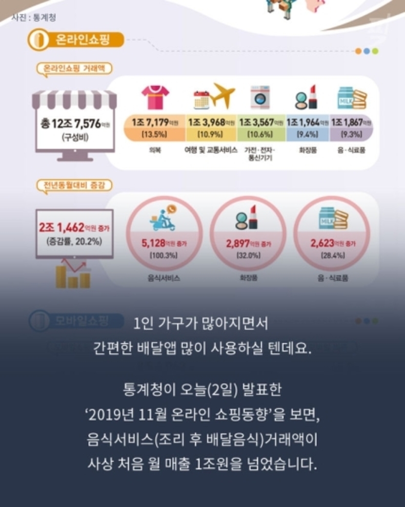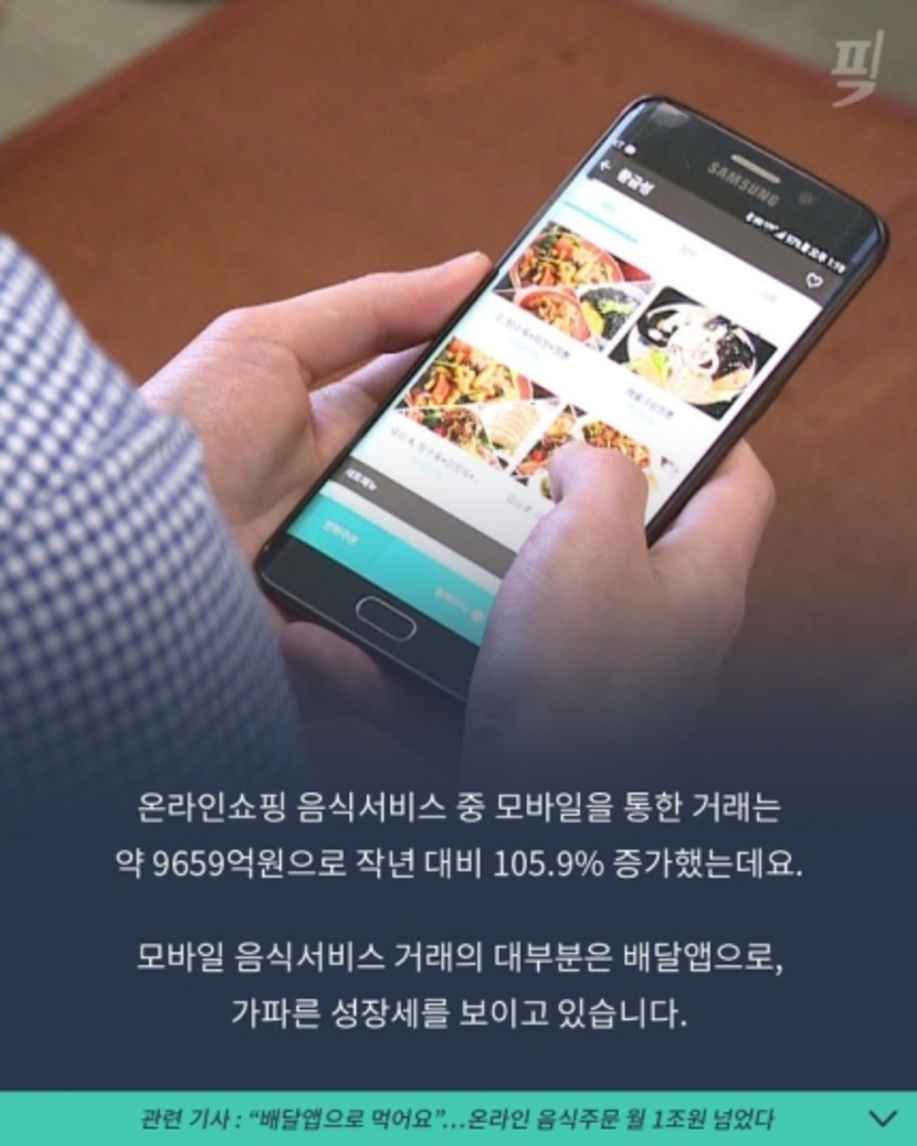20.01.02 102 읽음 [픽] “대세는 배달앱”…온라인 음식 주문 월 1조원 돌파 거품마리드 구독하기 0 1 콘텐츠의 수익 14 1인가구가 많아지면서 간편한 배달앱 많이 사용하실 텐데요.통계청이 오늘(2일) 발표한 '2019년 11월 온라인 쇼핑동향'을 보면, 음식서비스(조리 후 배달음식) 거래액이 사상 처음 월 매출 1조원을 넘었습니다.온라인쇼핑 음식서비스 중 모바일을 통한 거래는 약 9659억원으로 작년 대비 105.9% 증가했는데요.모바일 음식서비스 거래의 대부분은 배달앱으로, 가파른 성장세를 보이고 있습니다. 1 0 / 300 입력