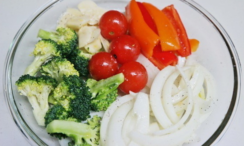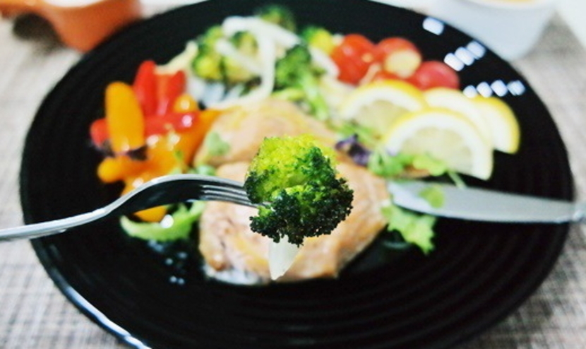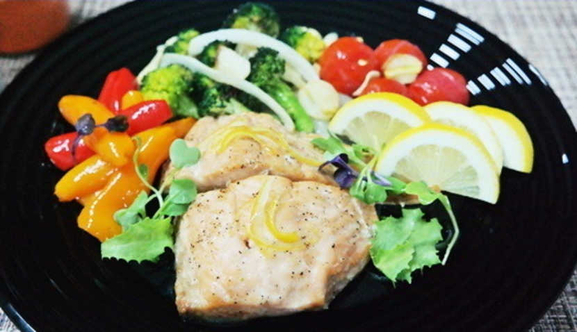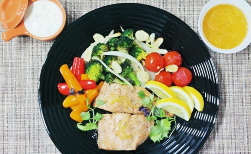 에어프라이어에서 구워낸 연어와 채소, 레몬을 담고 취향에 따라