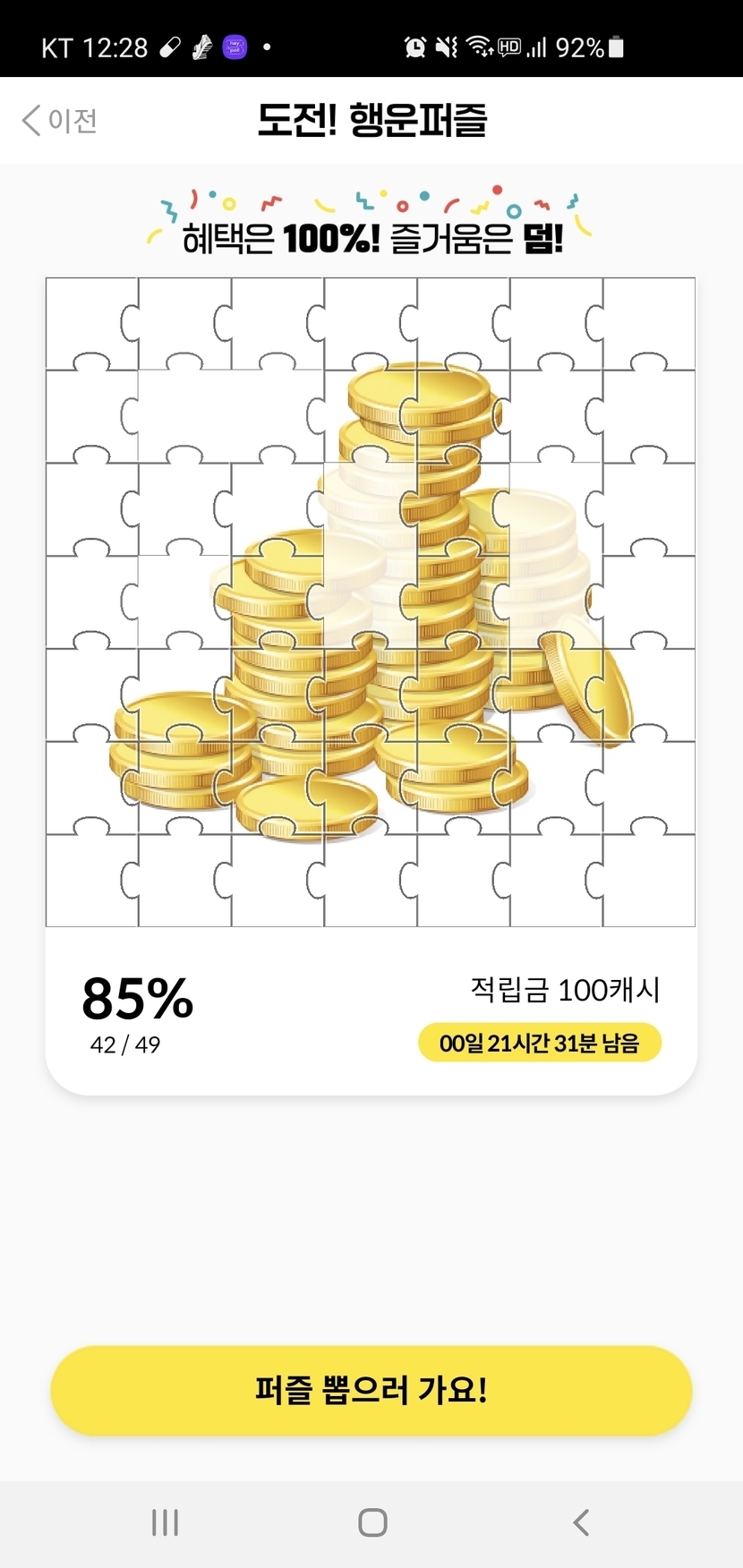 21.05.20 117 읽음 행운퍼즐 성공 ~^^ 낚시꾸운 구독하기 5 7 콘텐츠의 수익 1 오늘은 12시에 42개로 무난히 성공^^비도오고 바람도 많이 부네요~퇴근하실때 조심히들 퇴근하세요^^ 7 0 / 300 입력