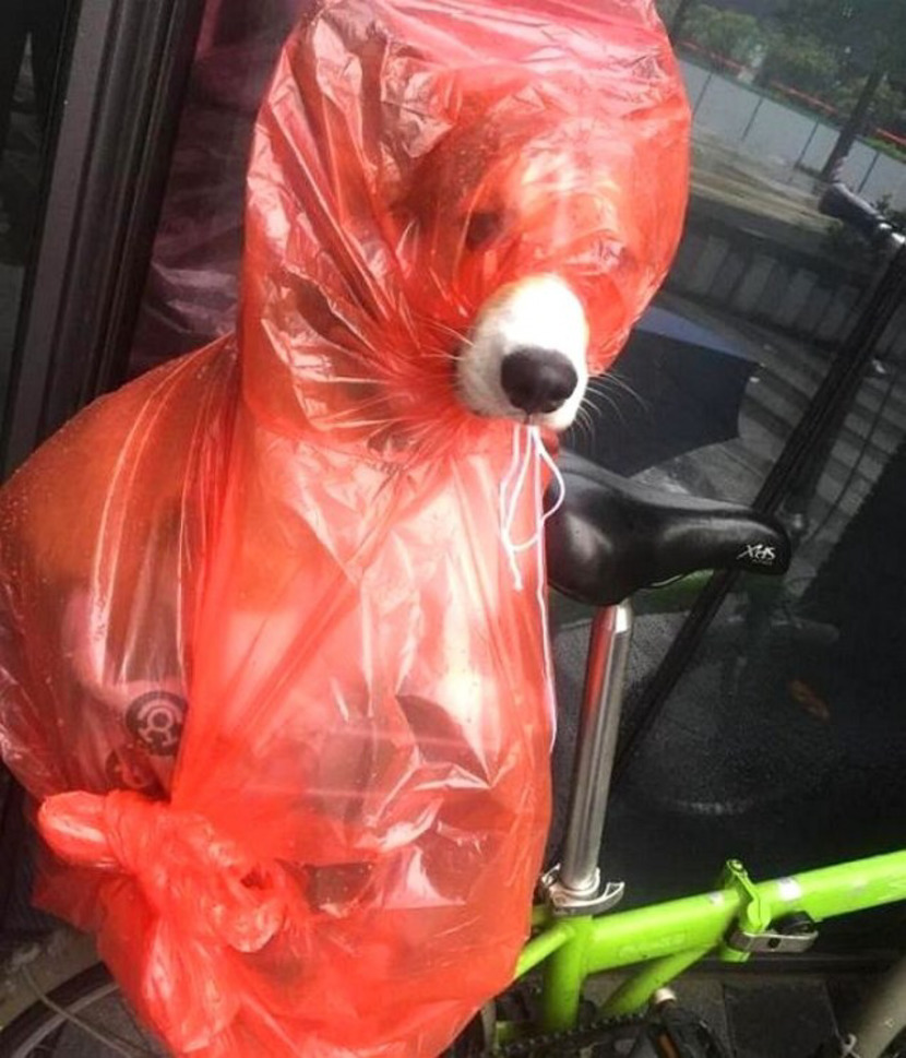 비닐봉지를 가져와 강아지를 칭칭 동여맸다.