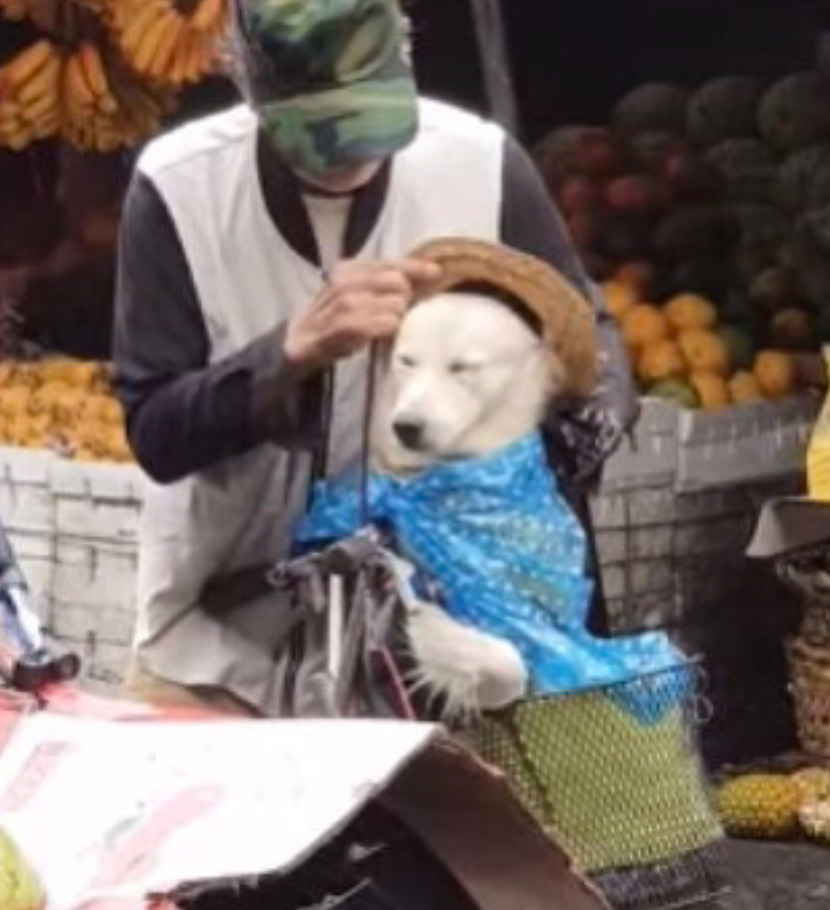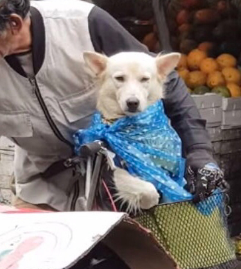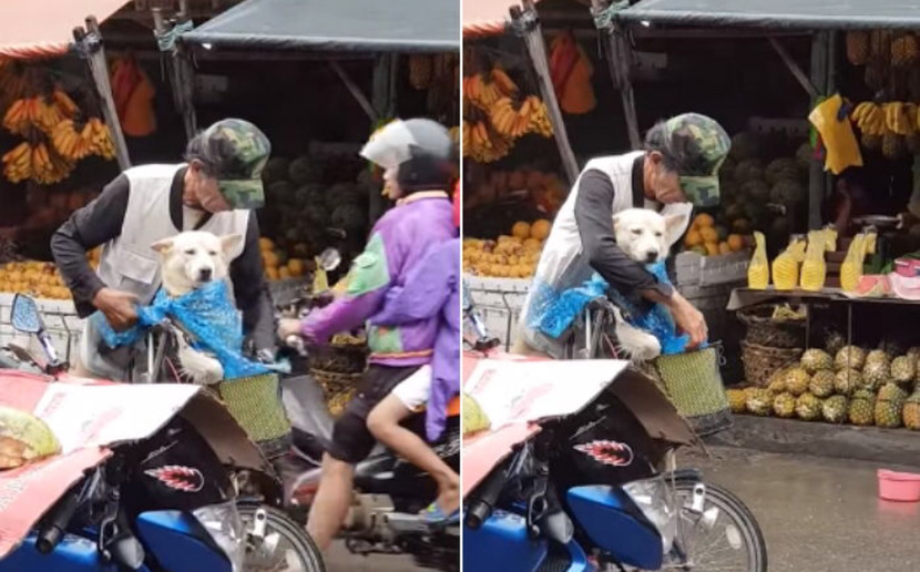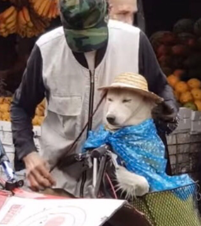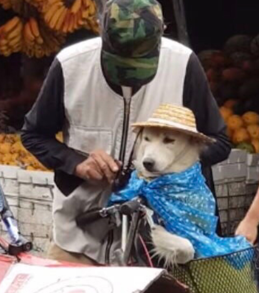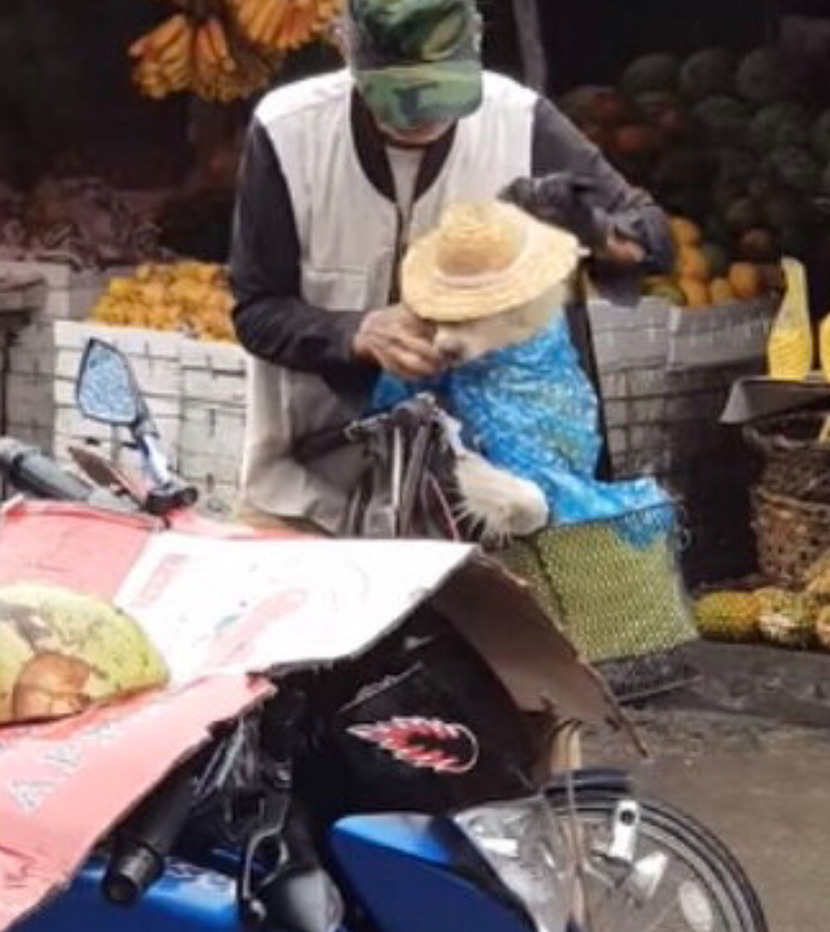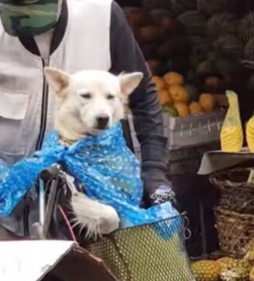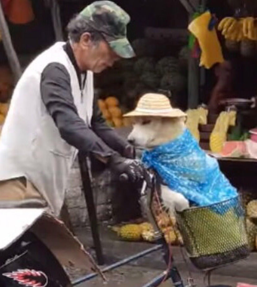 강아지를 자전거 앞 바구니에 태우고 시장에 나왔는데