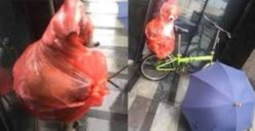 새빨간 비닐봉지 사이 까만 점이 하나 톡 튀어나와 있는데