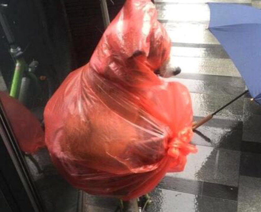 파란 비닐 우비를 강아지에게 덮어주며