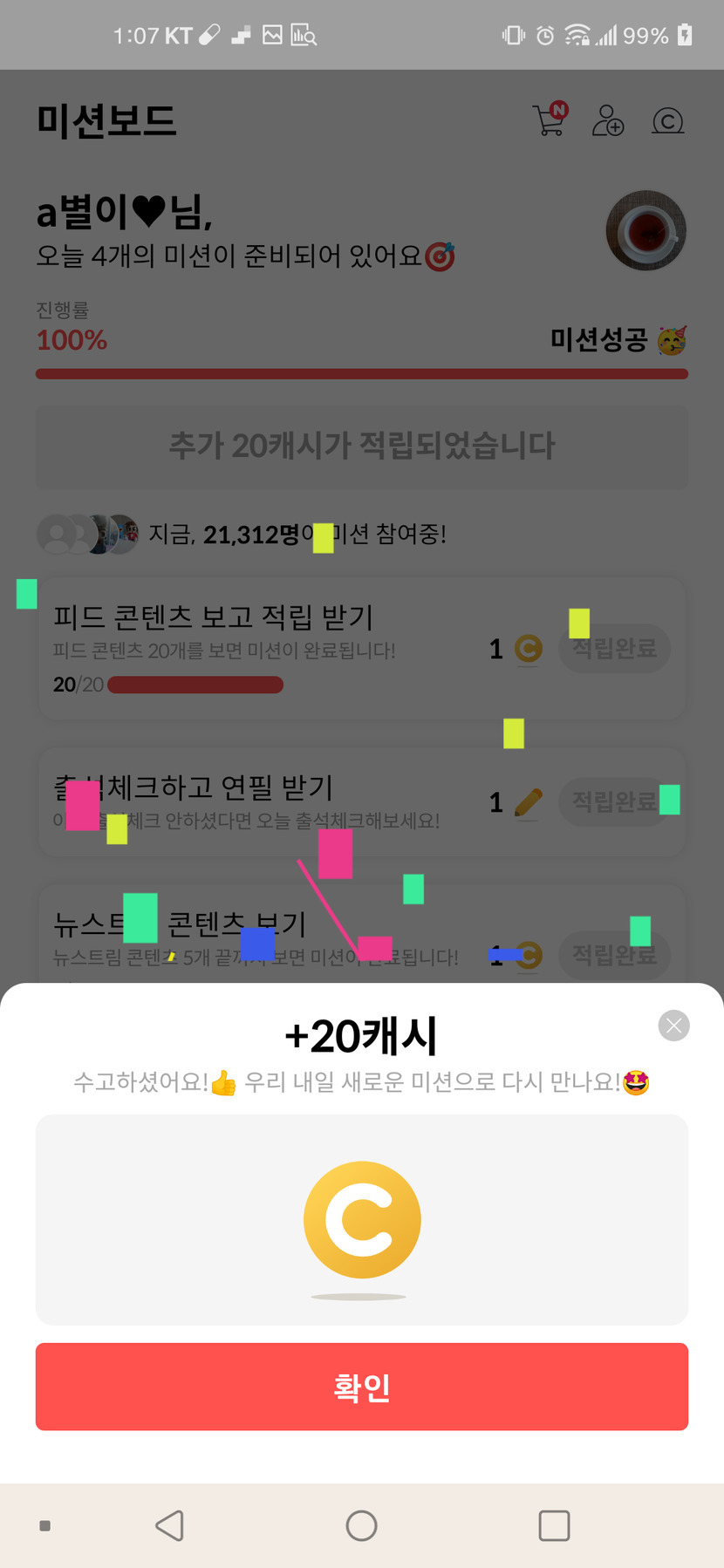 21.06.03 69 읽음 06.03 오늘의 미션 완료~🎉 a별이♥ 구독하기 13 15 콘텐츠의 수익 1 비가 추적추적 오는 목요일이네요~건강 조심하시고 행복한 하루 되세요~💕 15 0 / 300 입력