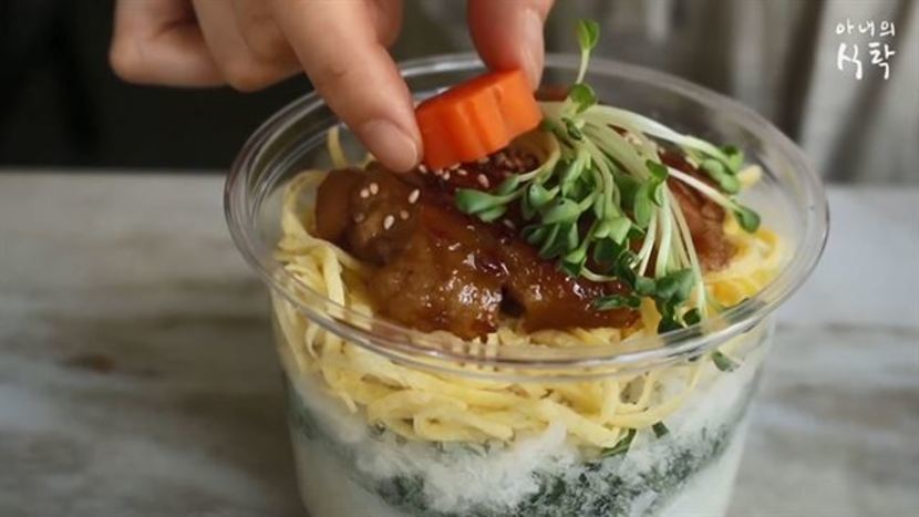 step 6. 컵에 밥-깻잎채-밥-지단채-먹기 좋게 자른 닭고기-무순 순으로 올리고 통깨를 뿌려주세요.