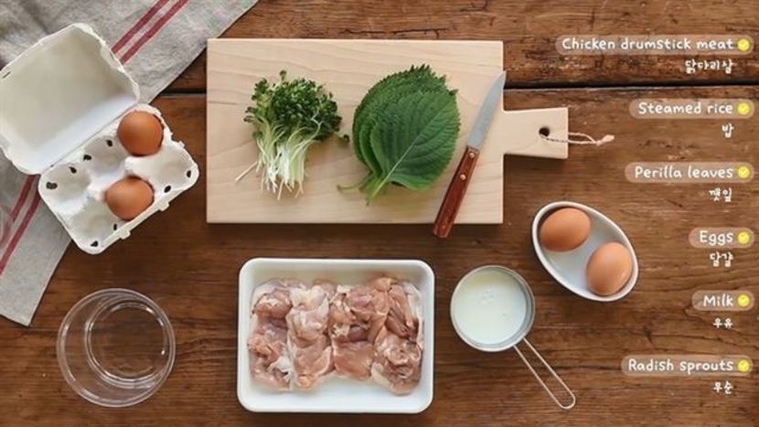 – 재료: 닭다리살 300g, 달걀 2개, 밥 2 공기, 깻잎 6장, 무순 1/4팩, 우유 1/2컵, 통깨 약간