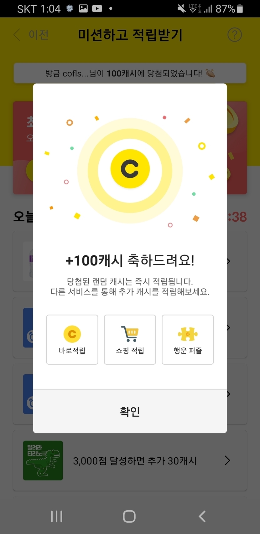 미션적립 100캐시 나왔어요!!!