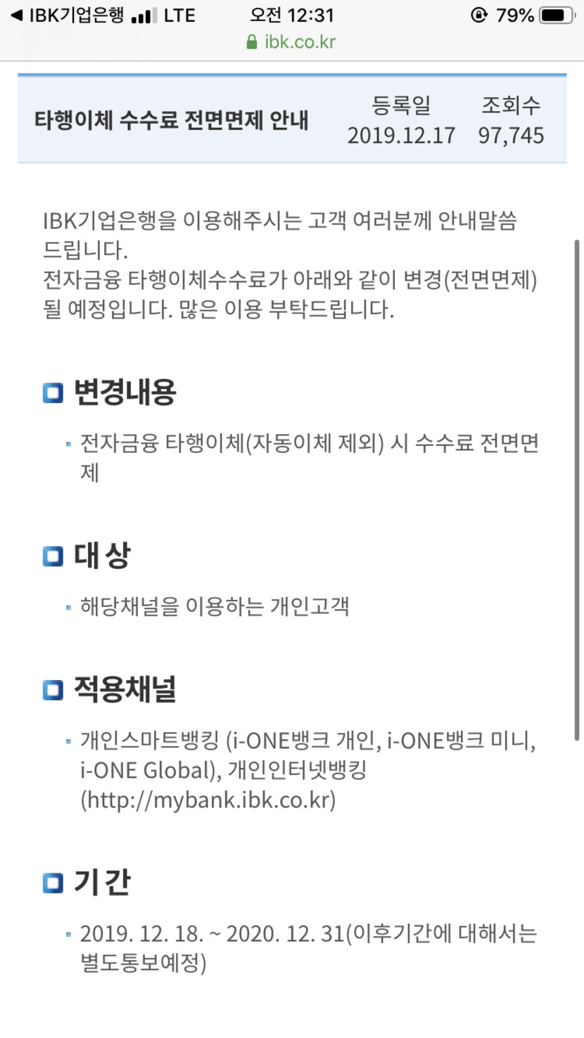 20.01.08 384 읽음 기업은행 수수료 전면 면제!! 興盡悲來 구독하기 34 70 콘텐츠의 수익 87 크 방금 기업은행 어플 들어갔는데 와우 이렇게 좋은 일을 해주다니 ㅠㅠㅠ 너무 좋네요 이제 송금 할때 걱정 없겠습니다! ㅎㅎ 70 0 / 300 입력