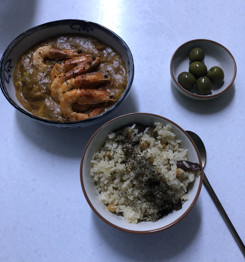 3분 카레에 새우만 구워서 얹었을 뿐인데 느낌이 다르네요~