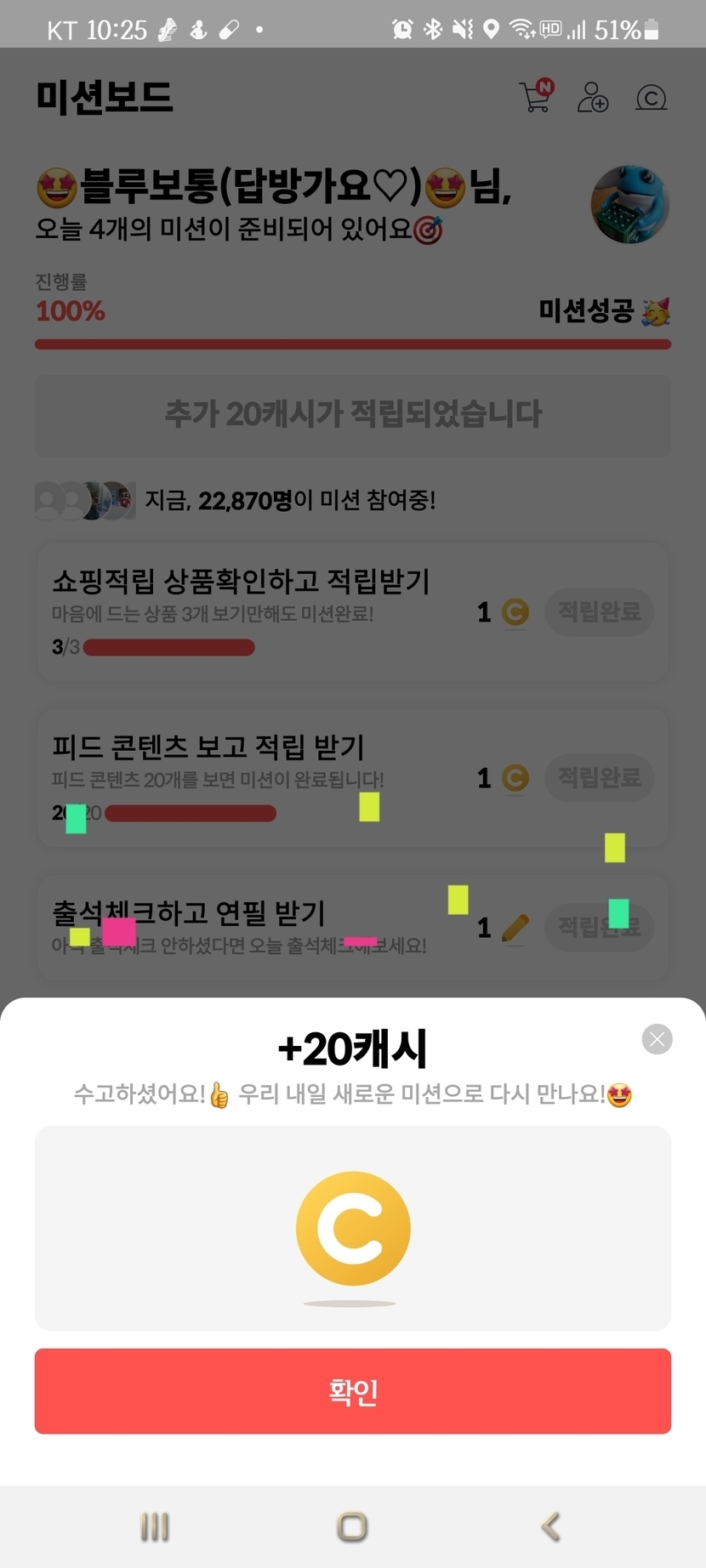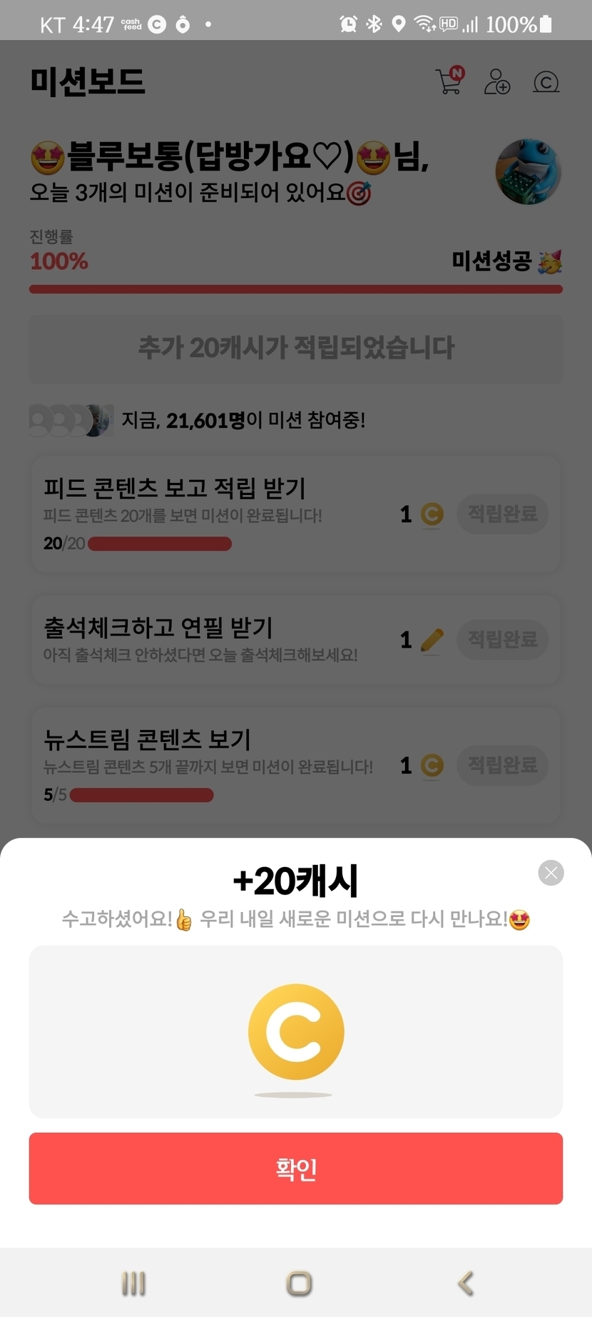 21.07.28 422 읽음 ❤미션완료 연속 20캐시❤ 🤩블루보통(답방가요♡)🤩 구독하기 170 174 콘텐츠의 수익 24 미션 완료하면 주로 3캐시만 나왔는데 그제 처음으로 20캐시 받았네요ㅎㅎ 신기해하고 있었는데 어제도 20캐시가 연속으로 나왔어요ㅎㅎ기준이 바뀐건가 했는데... 역시나 오늘은 3캐시네요ㅋ 174 0 / 300 입력
