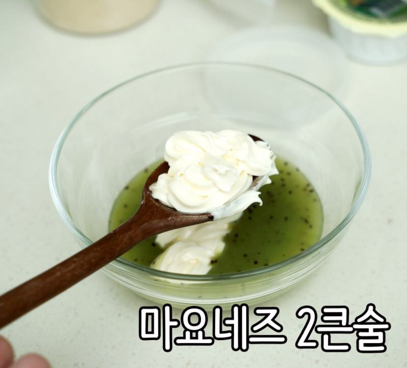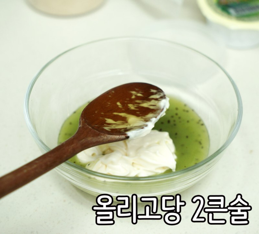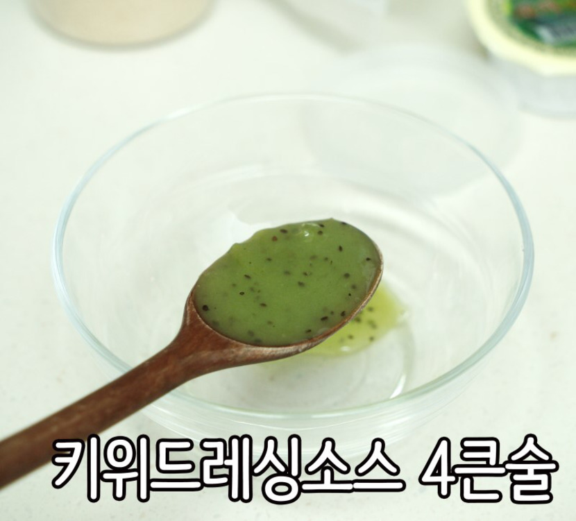 키위소스 만들기 시판 키위소스 : 마요네즈 : 올리고당 : 설탕 2 : 2 : 1 : 0.5 비율로 만들어주면 되는데요 ~~저는 키위소스 4T로 만들었답니다