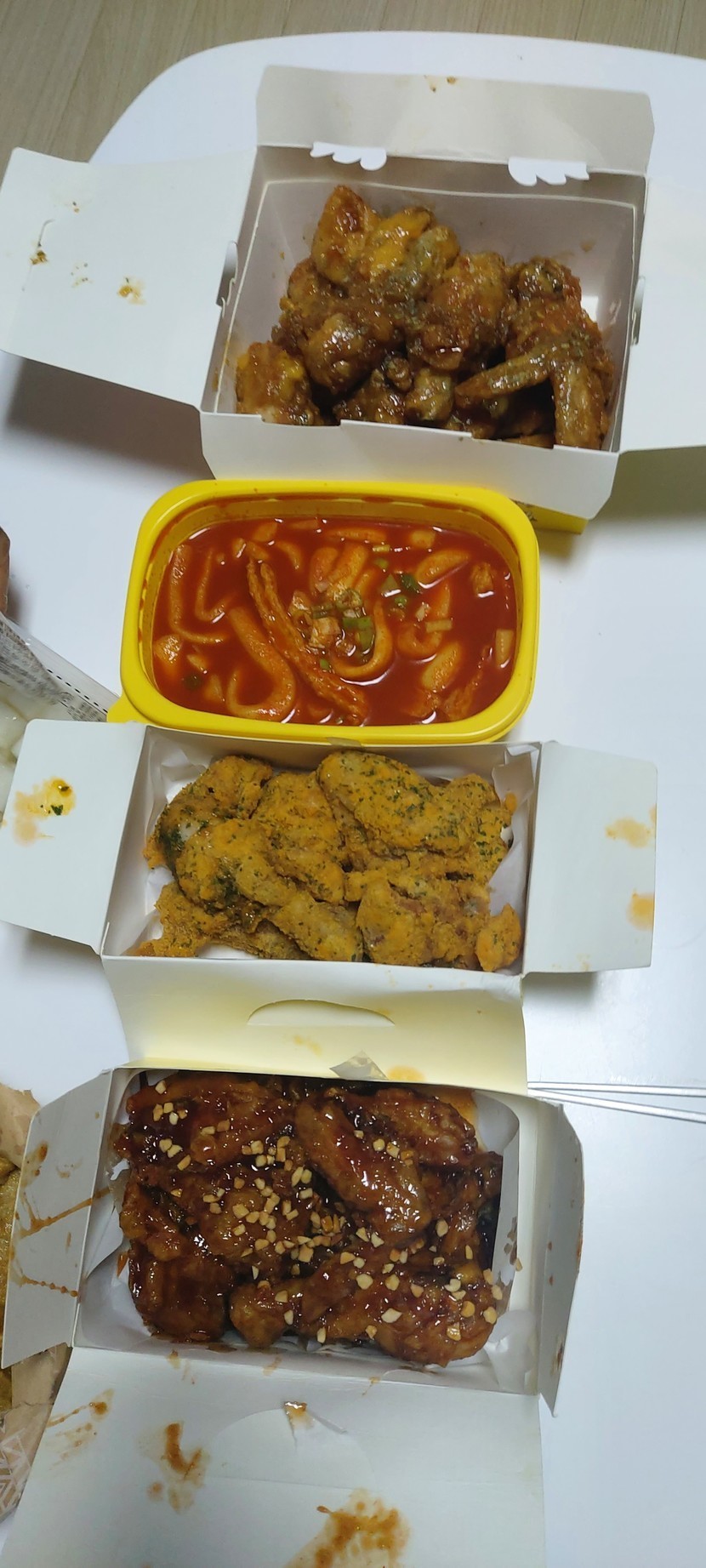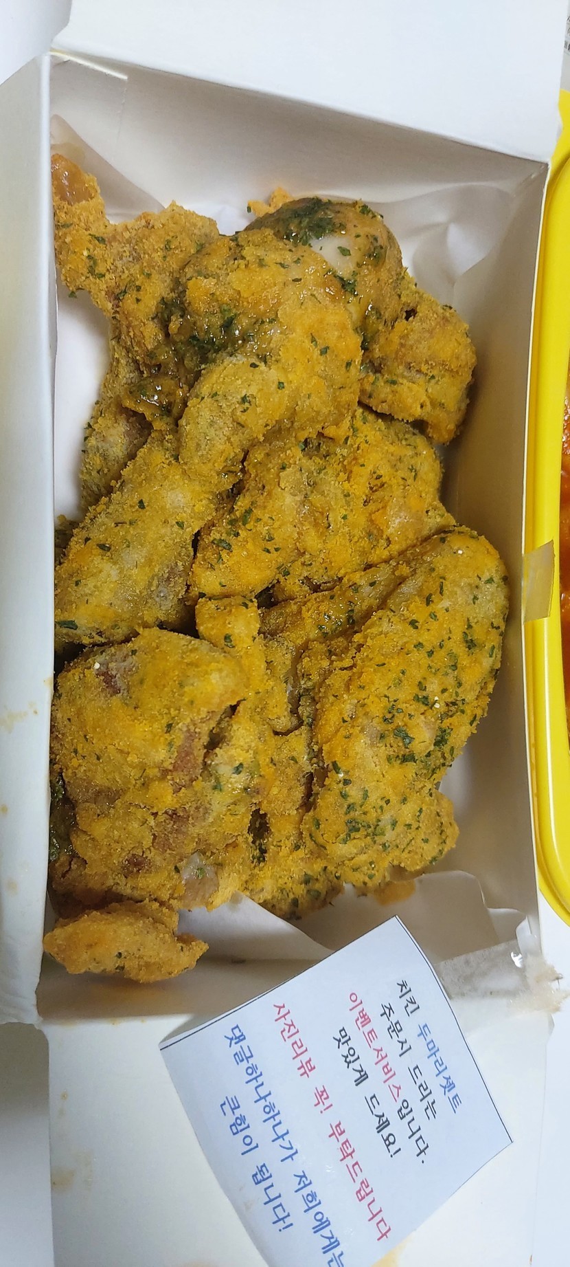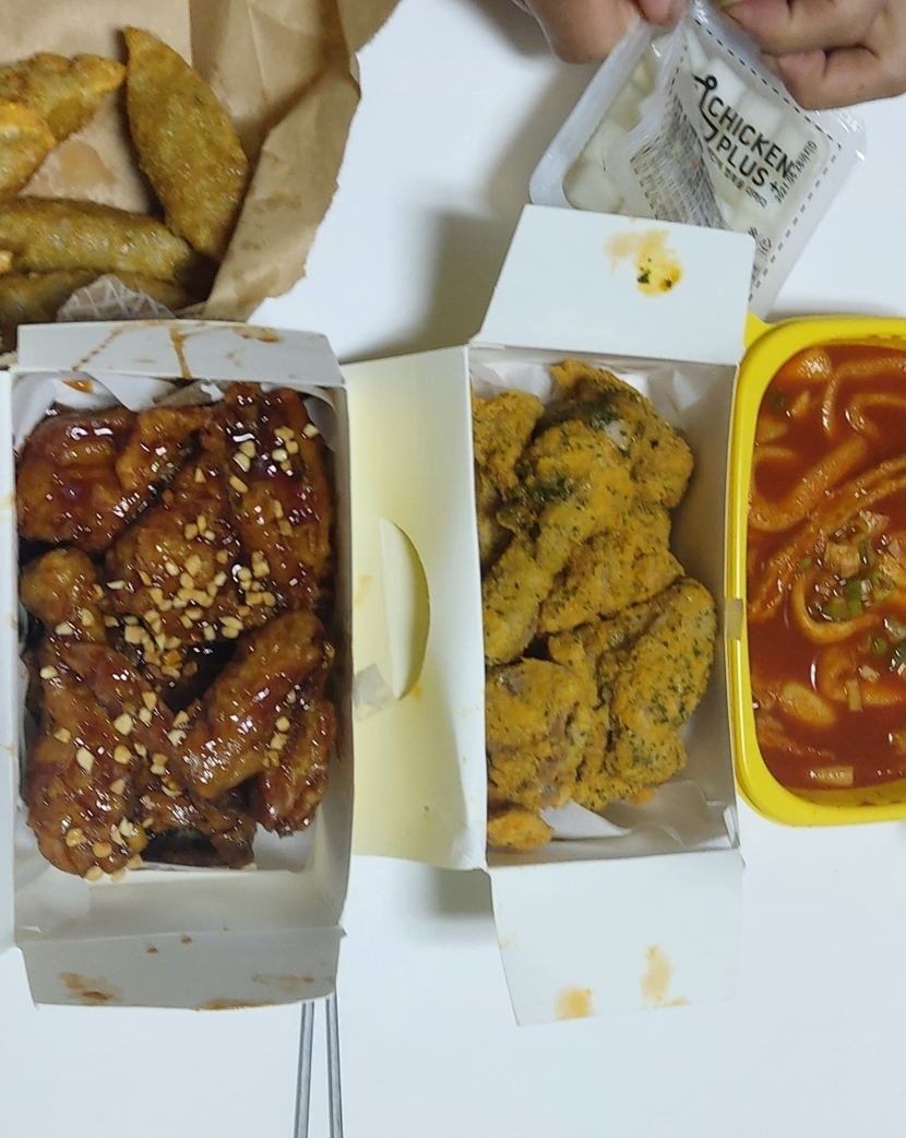 21.08.15 484 읽음 EP. 93 저녁은 치킨플러스에서 알뜰산뜰 구독하기 79 87 콘텐츠의 수익 13 처음 먹어보는데 치킨을 안 좋아해서 떡볶이가 있는 곳으로 시켰다.치킨은 그냥 그럭저럭, 떡볶이는 맛있었다. 살찔랑가 몰라 저녁으로 치킨~~아, 치킨 + 떡볶이 세트, 치킨 반반해서 2개 시켰고만두는 서비스로 주셨어요 87 0 / 300 입력