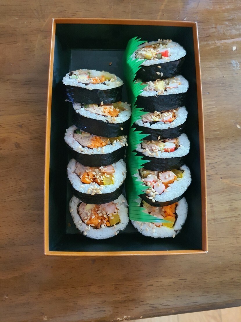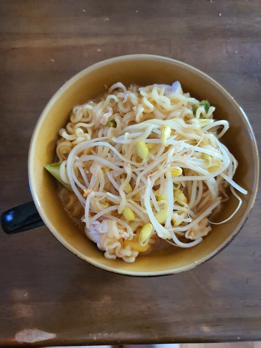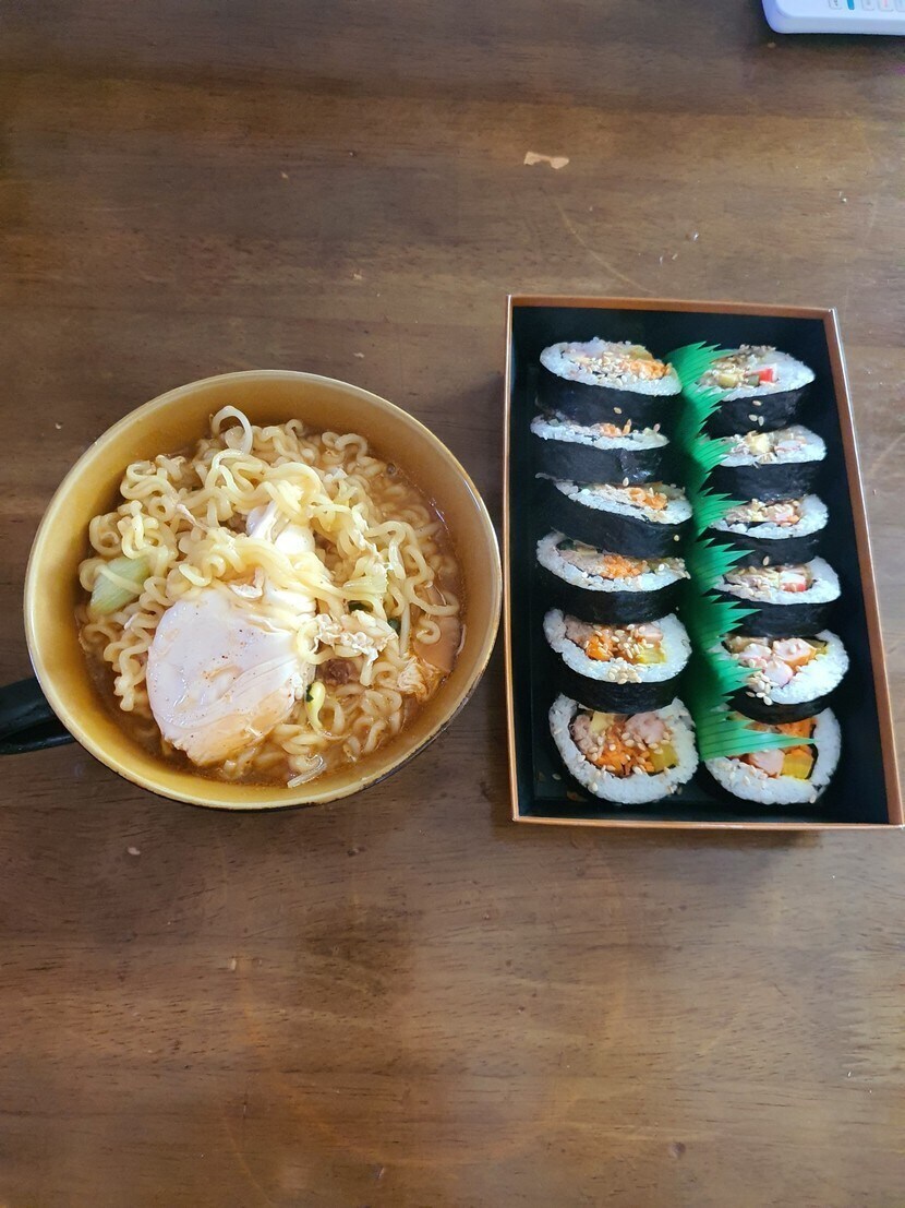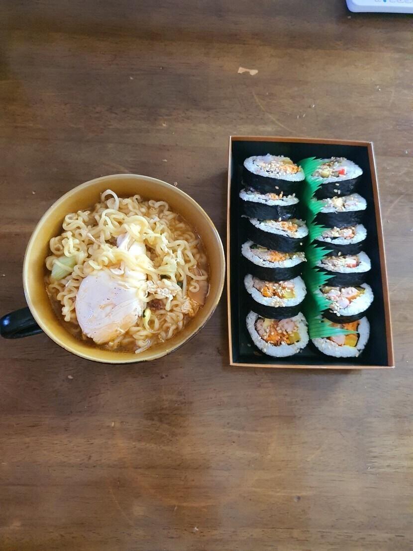 아점으로 참치김밥과 콩나물 치즈라면 입니다 ㅎㅎ