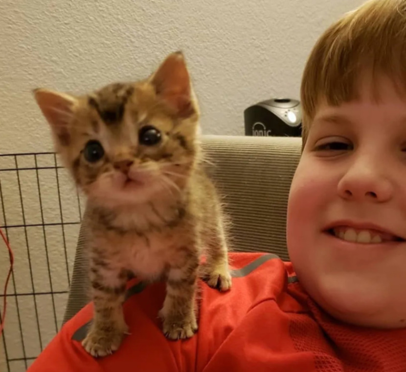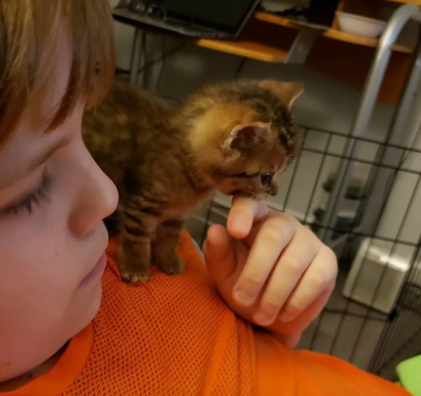 아기 고양이 마우스는 자신에게 밥을 먹여준 앨리사 씨의 아들의 어깨 위로 올라 네 발로 당당히 일어섰습니다. 커다란 눈망울로 자신의 눈앞에 있는 사람들을 관심 있게 지켜보곤 합니다.