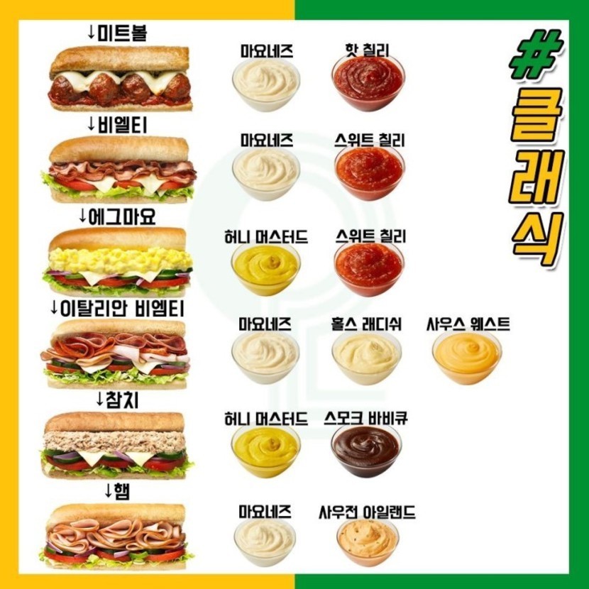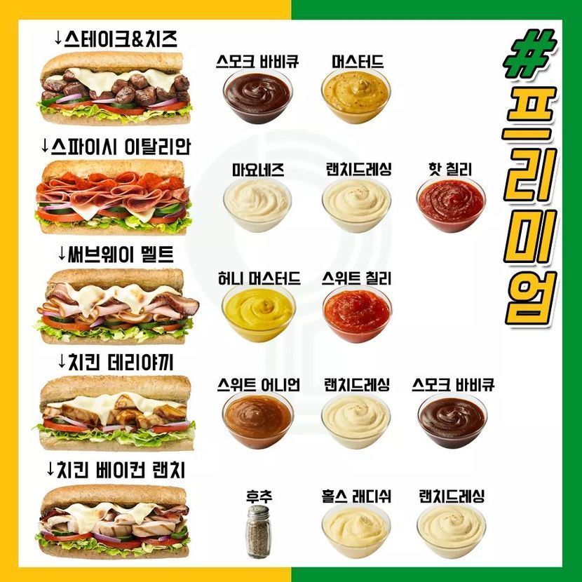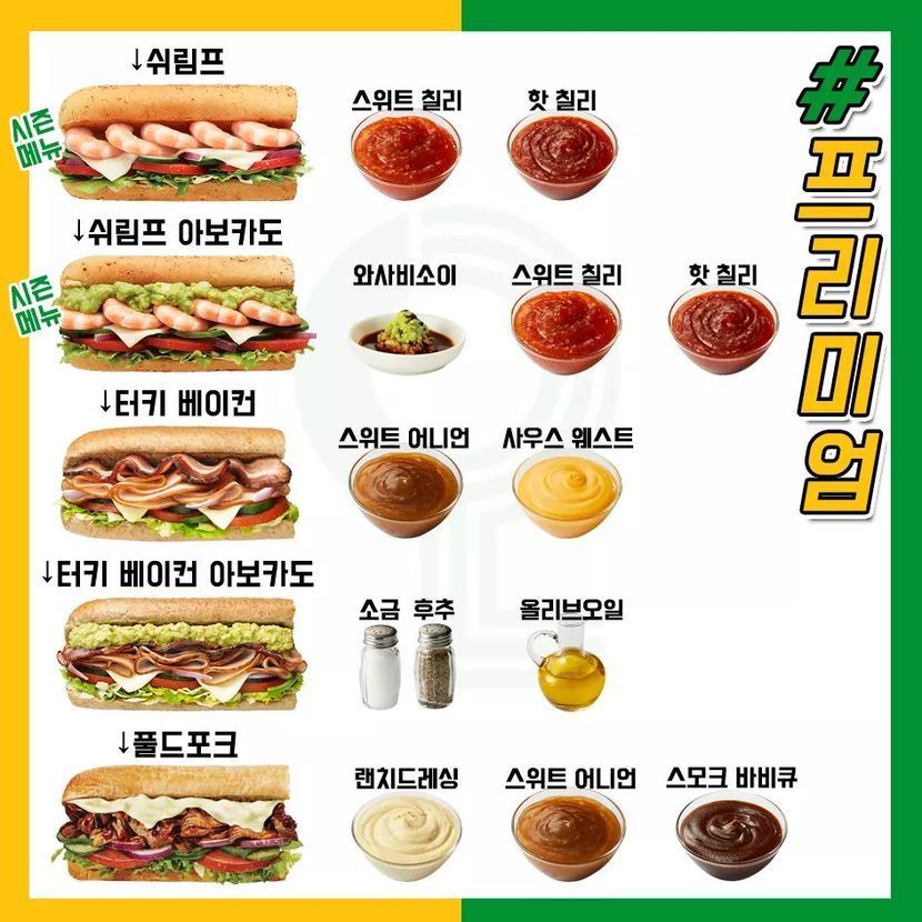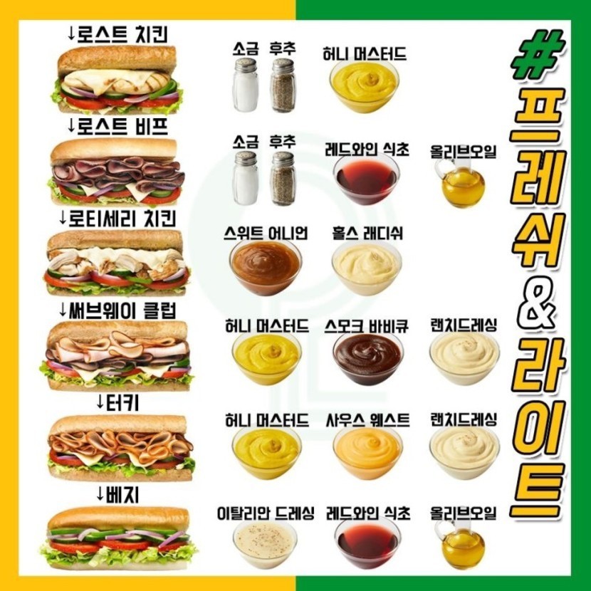 20.01.22 291 읽음 서브웨이 맛있게 먹는 법! 자신의 메뉴를 추천해주세요!! 우리 집 강아지 이름 호랭이♡ 구독하기 4 30 콘텐츠의 수익 66 이번에 저희 지역에도 서브웨이가 생겼답니다! 와아아아아!!!그래서 서브웨이 가기 전 팁으로 인터넷에서 돌아다니는 맛있게 먹는 법을 모아봤어요!자신이 추천하는 메뉴, 소스,제조방법 등을 알려주세요!!설날 끝나고 가볼 계획입니다!^○^ 30 0 / 300 입력