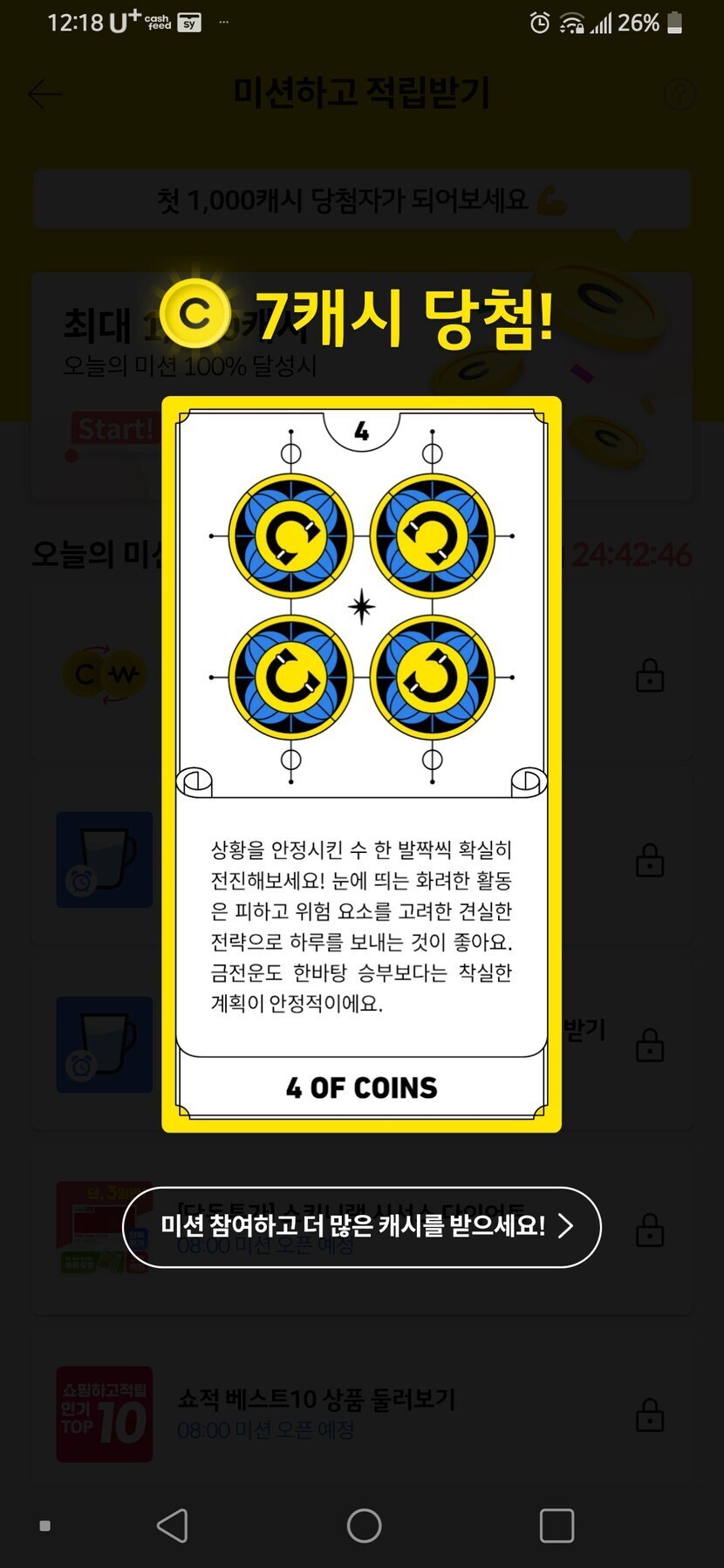 21.10.06 184 읽음 캐시로 시작하는 하루~ ♥오늘 더 감사해♥ 구독하기 16 18 콘텐츠의 수익 4 오늘도 캐시 모으며 하루를 시작하네요모두 힘내시고 화이팅 하시길 바래요!!건강하시고 행복하세요~~^^ 18 0 / 300 입력