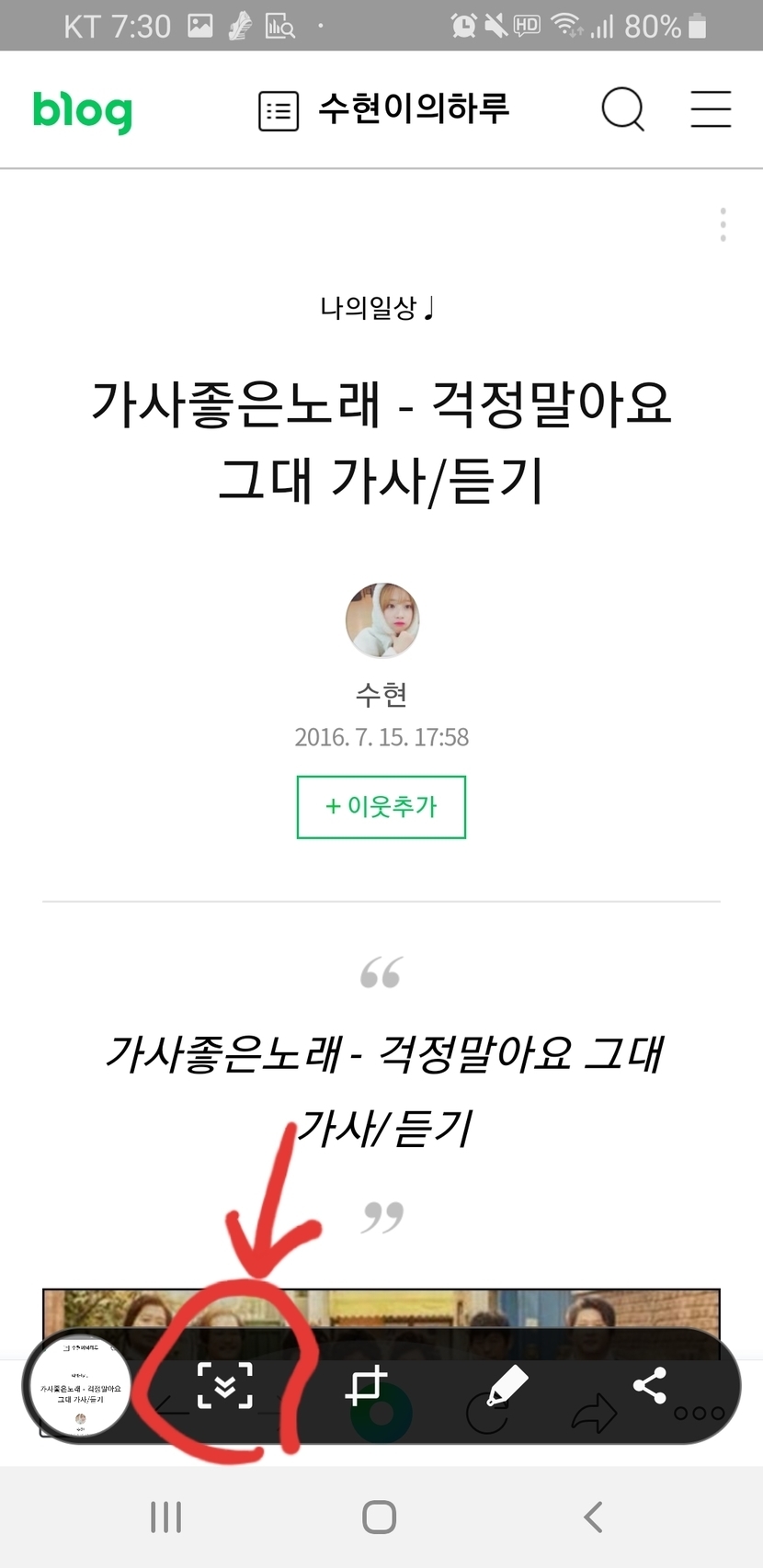 20.01.22 410 읽음 스크린샷 길~~~게 하는 꿀팁!!❤ 책읽는양양이(답방♡) 구독하기 3 27 콘텐츠의 수익 103 스크린샷 직후 아래 뜨는 아이콘 중에 빨간 화살표로 표시한 걸 누르면 스크롤한 후 스샷한 것처럼 길~~~게 캡쳐됩니당! 참 쉽죠!?^^ 27 0 / 300 입력