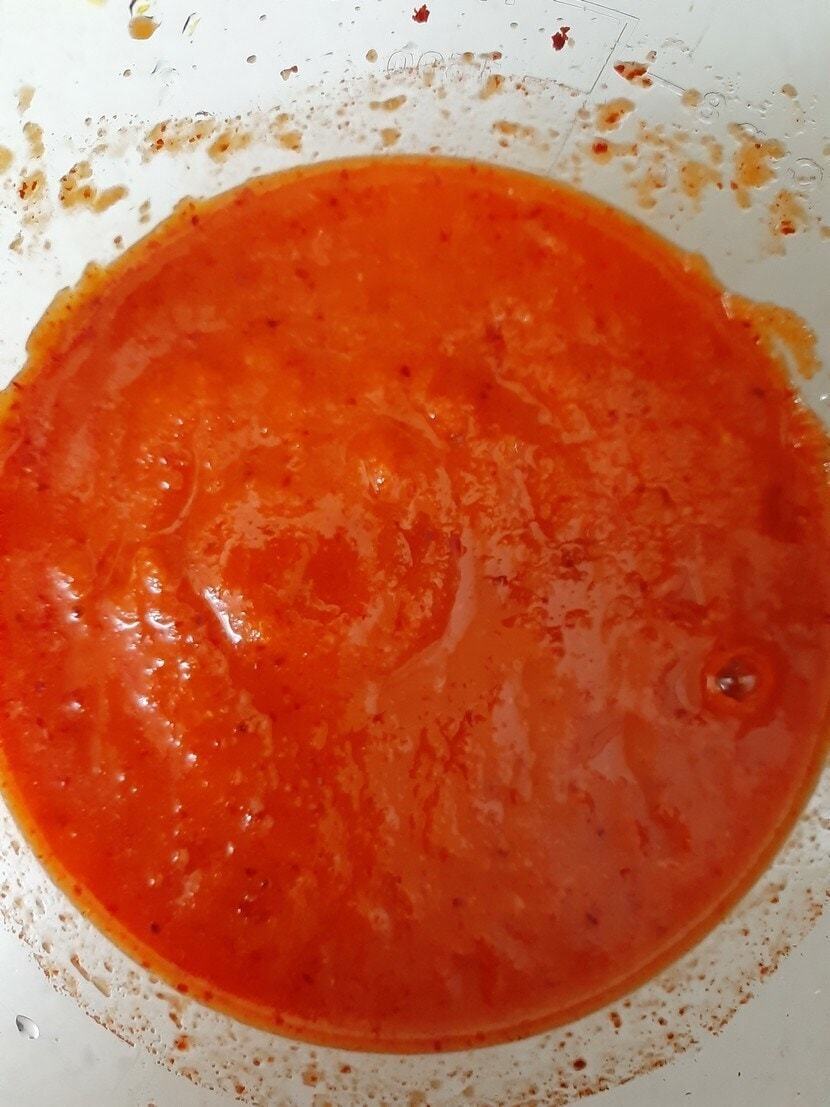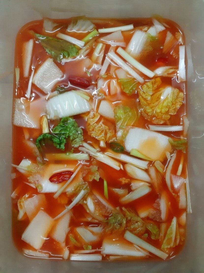 배 1개, 양파 반 개, 고추가루 반 컵, 찹쌀풀을 갈아서 면보자기에 넣고 주물주물 치대면서 물 2리터와 소금 2큰술 추가