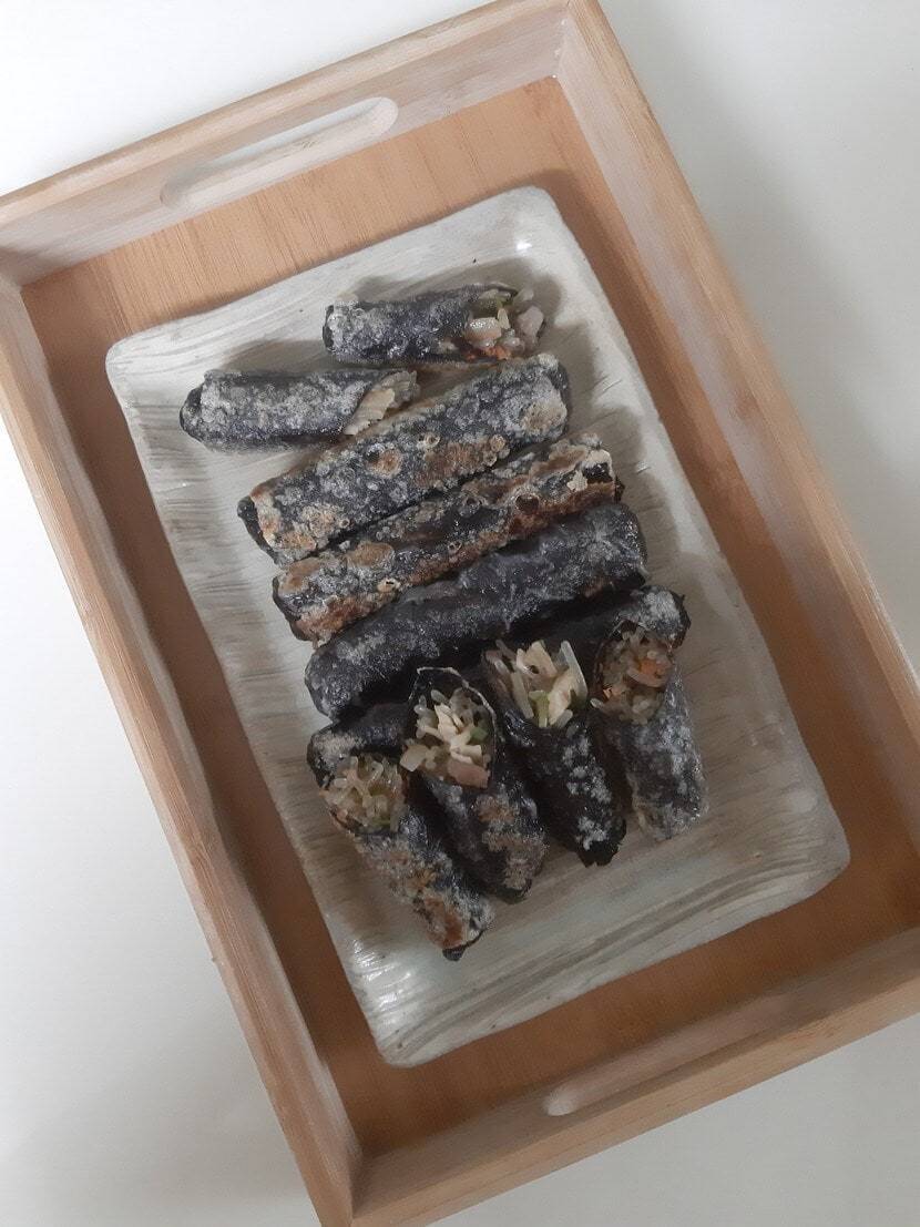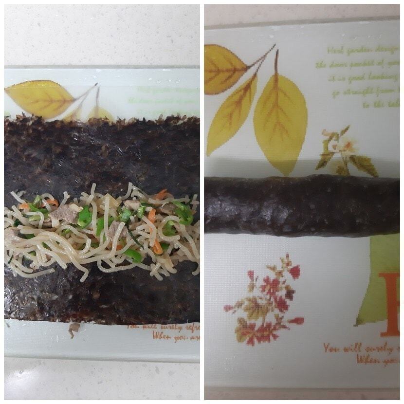 라이스 페이퍼를 찬물이나 따뜻한 물에 적셔 펼치고, 그 위에 김 반 장 올려서 잡채를 가지런히 놓아요